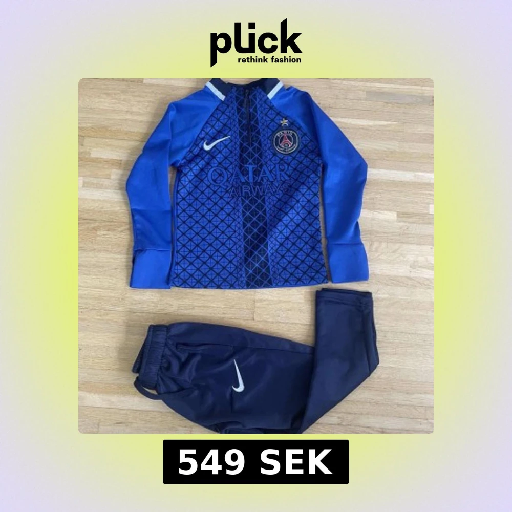 Snygg blå långärmad fotbollströja från Paris Saint-Germain med geometriskt mönster, PSG-emblem och Qatar Airways-tryck. Tröjan har dragkedja vid halsen och vita Nike-loggor. Materialet är funktionspolyester, perfekt för träning.