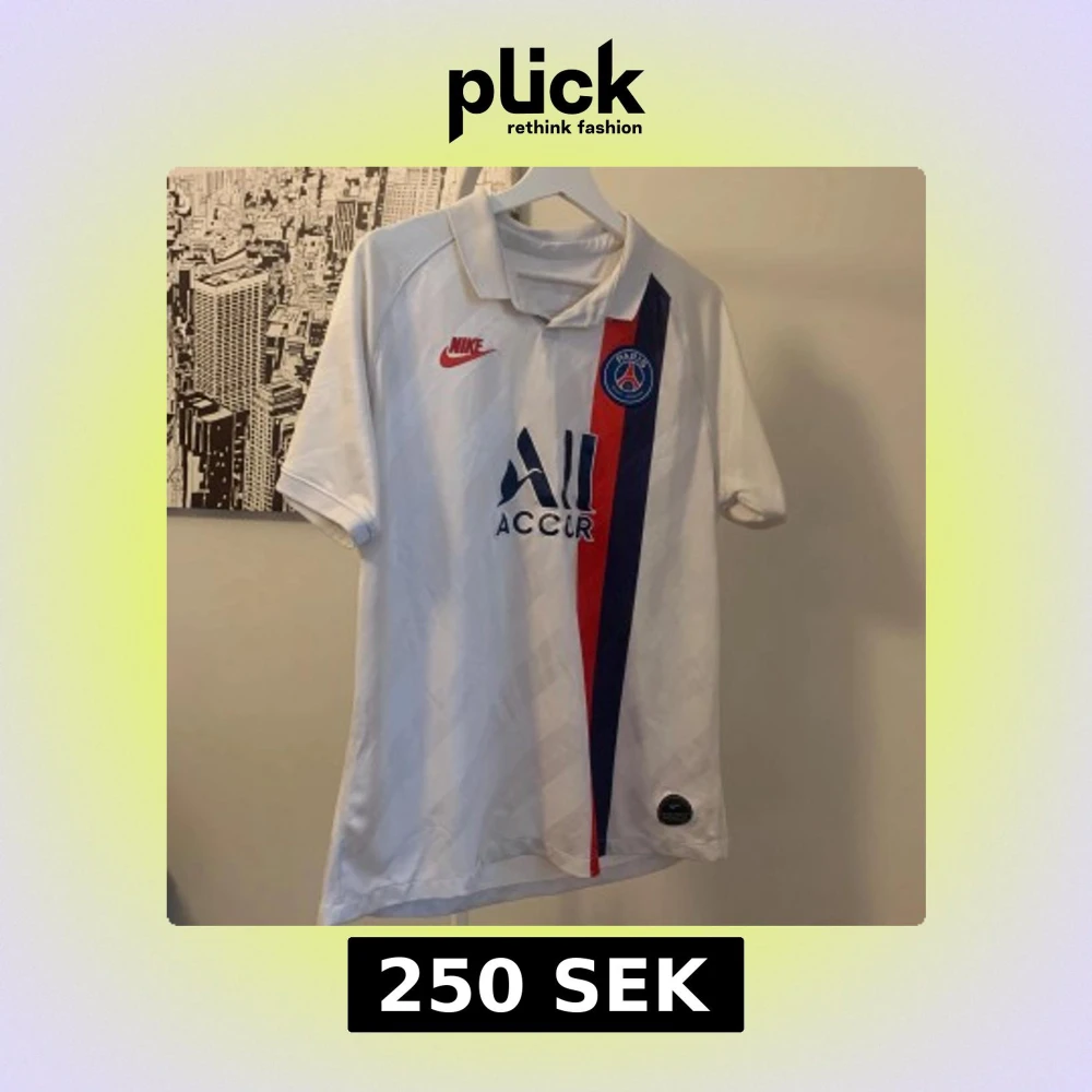 Säljer en vit PSG fotbollströja från Nike med klubbmärke på bröstet och röd-blå diagonal rand. Tröjan har korta ärmar, klassisk krage och tryckt sponsorlogga på framsidan. Perfekt för dig som älskar fotboll och vill visa ditt stöd för Paris Saint-Germain.