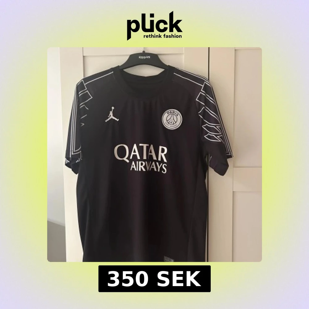Säljer en svart PSG fotbollströja med vita detaljer och tryck, Jordan-logga och Qatar Airways sponsor på bröstet. Nummer 14 och D. Doué på ryggen. Snygga grafiska linjer på ärmarna. Tillverkad i lätt och ventilerande material.