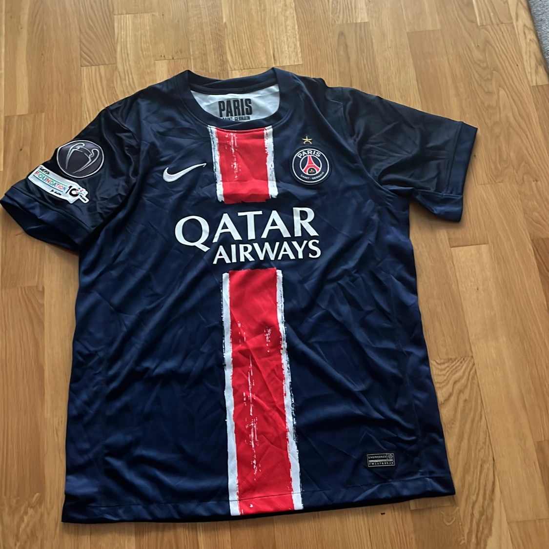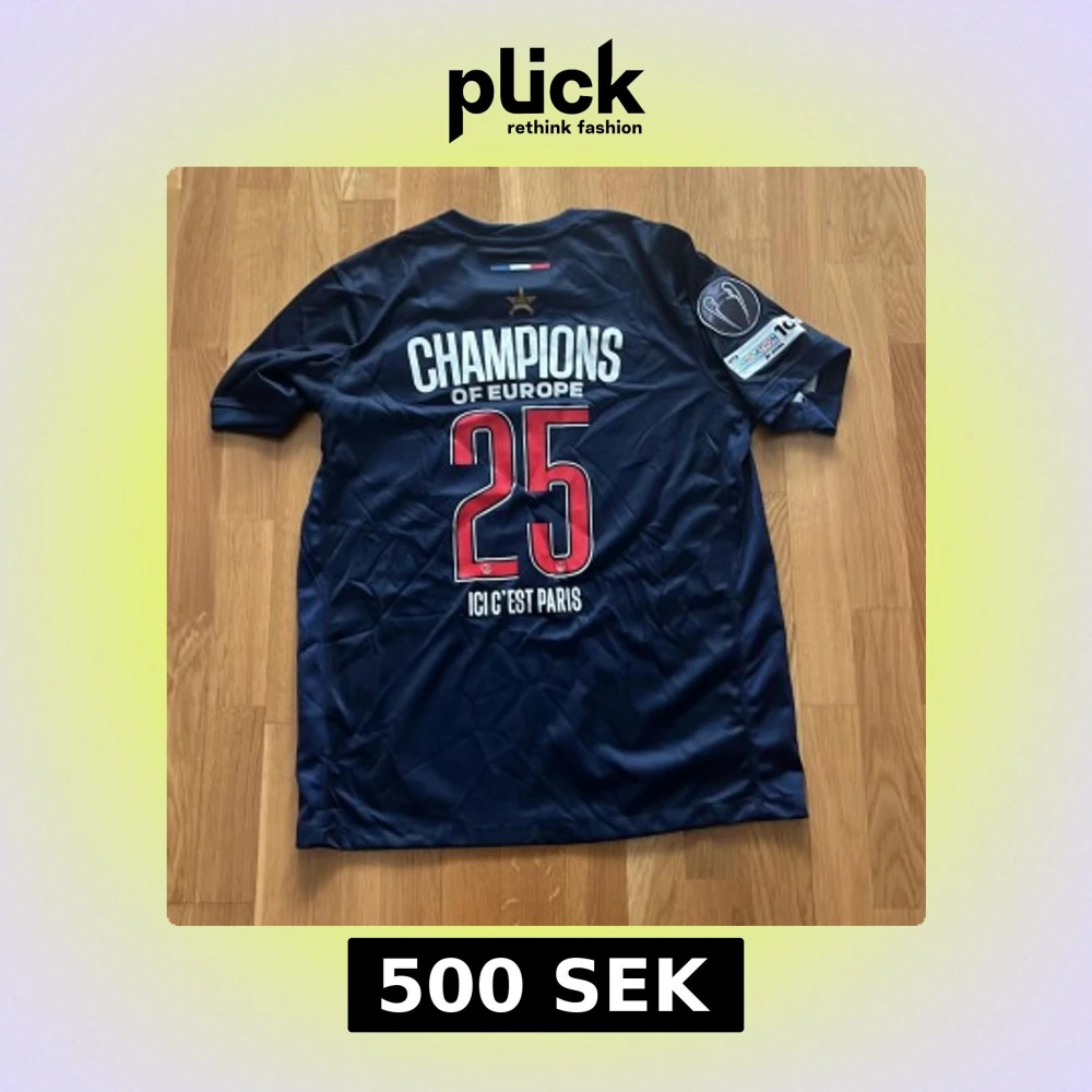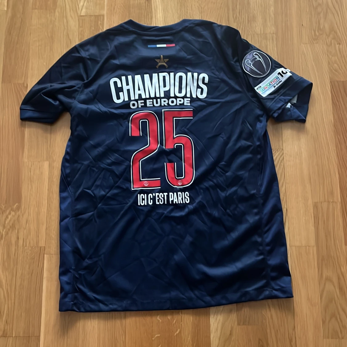 Snygg PSG fotbollströja med mörkblå bas, röd och vit rand längs mitten, och tryckta detaljer som 'Champions of Europe' och nummer 25 på ryggen.