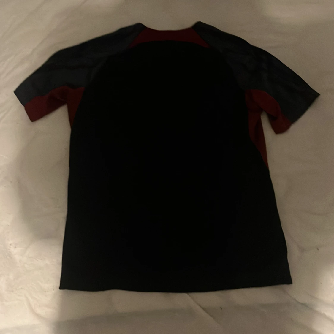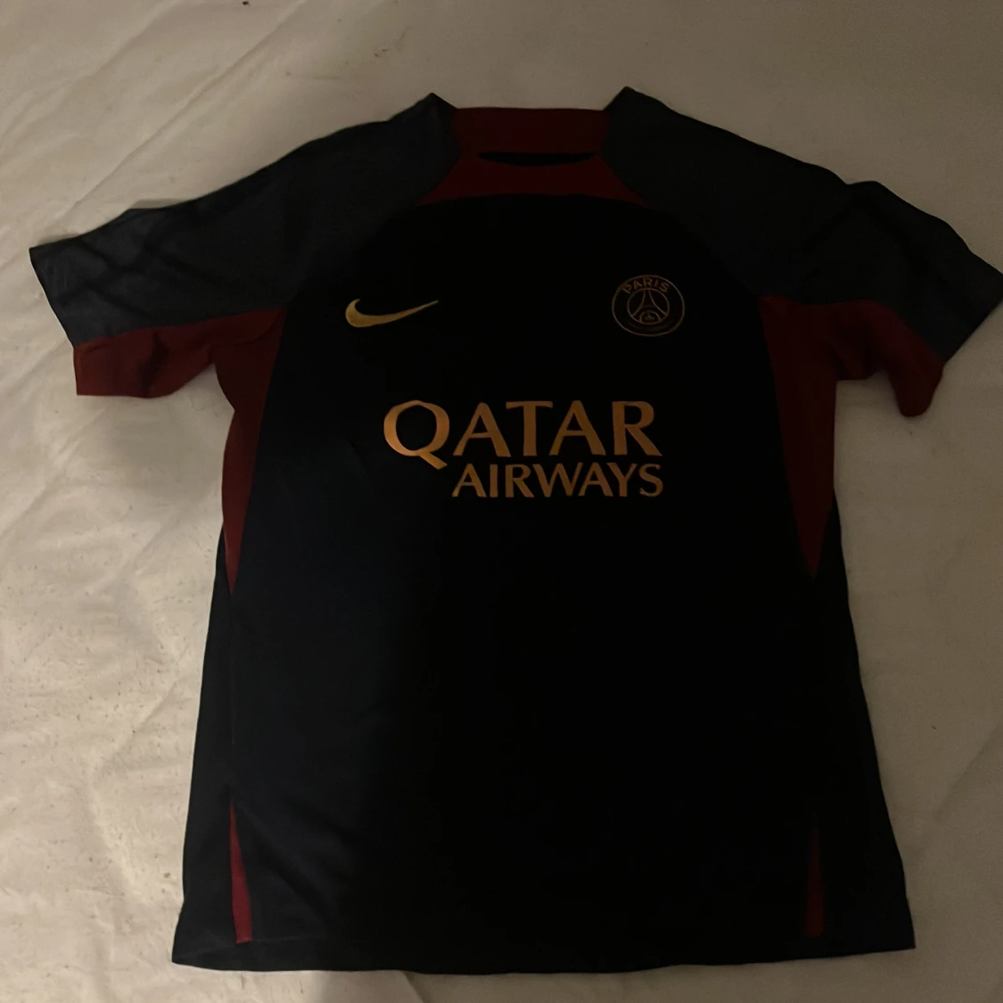 Snygg svart och röd fotbollströja från Nike med korta ärmar. Tröjan har en gul Nike-logga och Qatar Airways som sponsortryck på framsidan. Perfekt för fotbollsfans som vill visa sitt stöd.Nästan aldrig använd