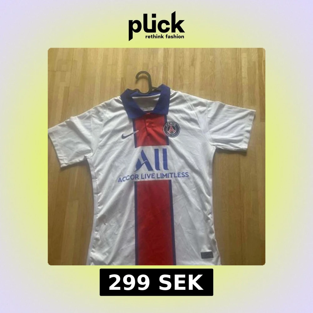 Paris Saint-Germain fotbollströja från Nike i vit polyester med blå krage och korta ärmar. Framsidan har en röd vertikal rand och blå detaljer, samt PSG-logga och sponsortryck. Perfekt för dig som vill representera PSG på match eller träning.
