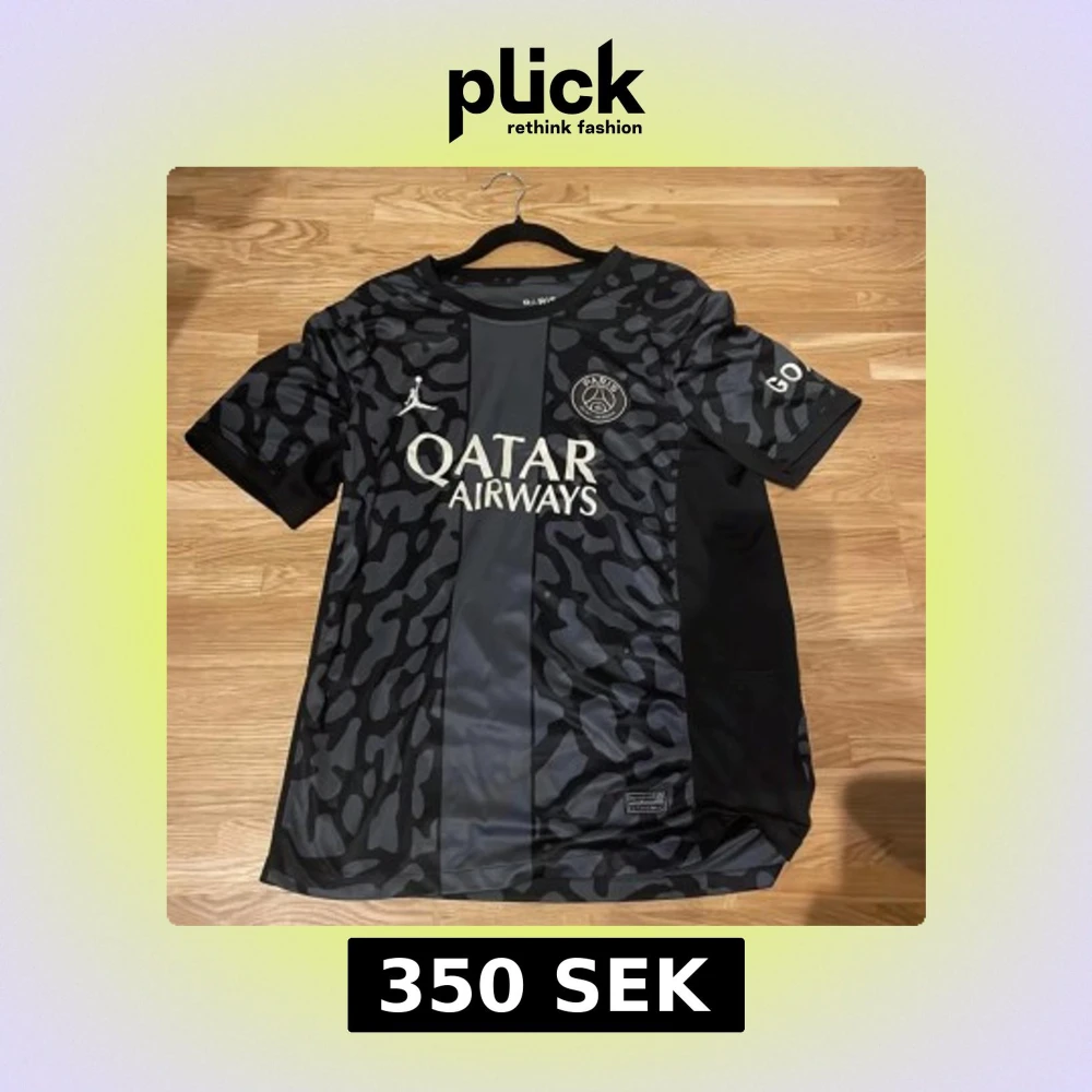 Snygg PSG fotbollströja i samarbete med Jordan. Tröjan är svart med mörkgrå camouflage-mönster och har vita loggor för Jordan, PSG och Qatar Airways. Tillverkad i lätt och ventilerande material, perfekt för match eller träning. Klassisk rund hals och korta ärmar.