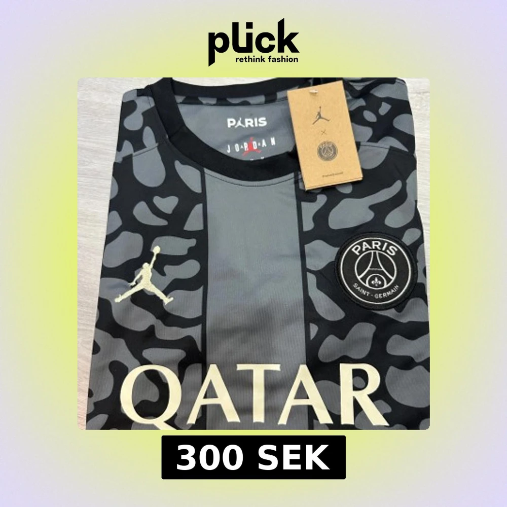 Snygg PSG x Jordan fotbollströja i svart och grått med unikt camouflageinspirerat mönster. Tröjan har korta ärmar, rund hals och tryckta loggor från både Jordan och PSG samt Qatar Airways som sponsor. Tillverkad i lätt och ventilerande material, perfekt för match eller träning.
