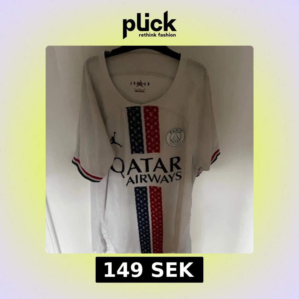 Snygg PSG fotbollströja i vitt från Jordan med Qatar Airways tryck på bröstet. Tröjan har korta ärmar med röd, blå och vit kant, samt två vertikala ränder i blått och rött med mönster. Materialet är lätt och andas, perfekt för match eller träning.
