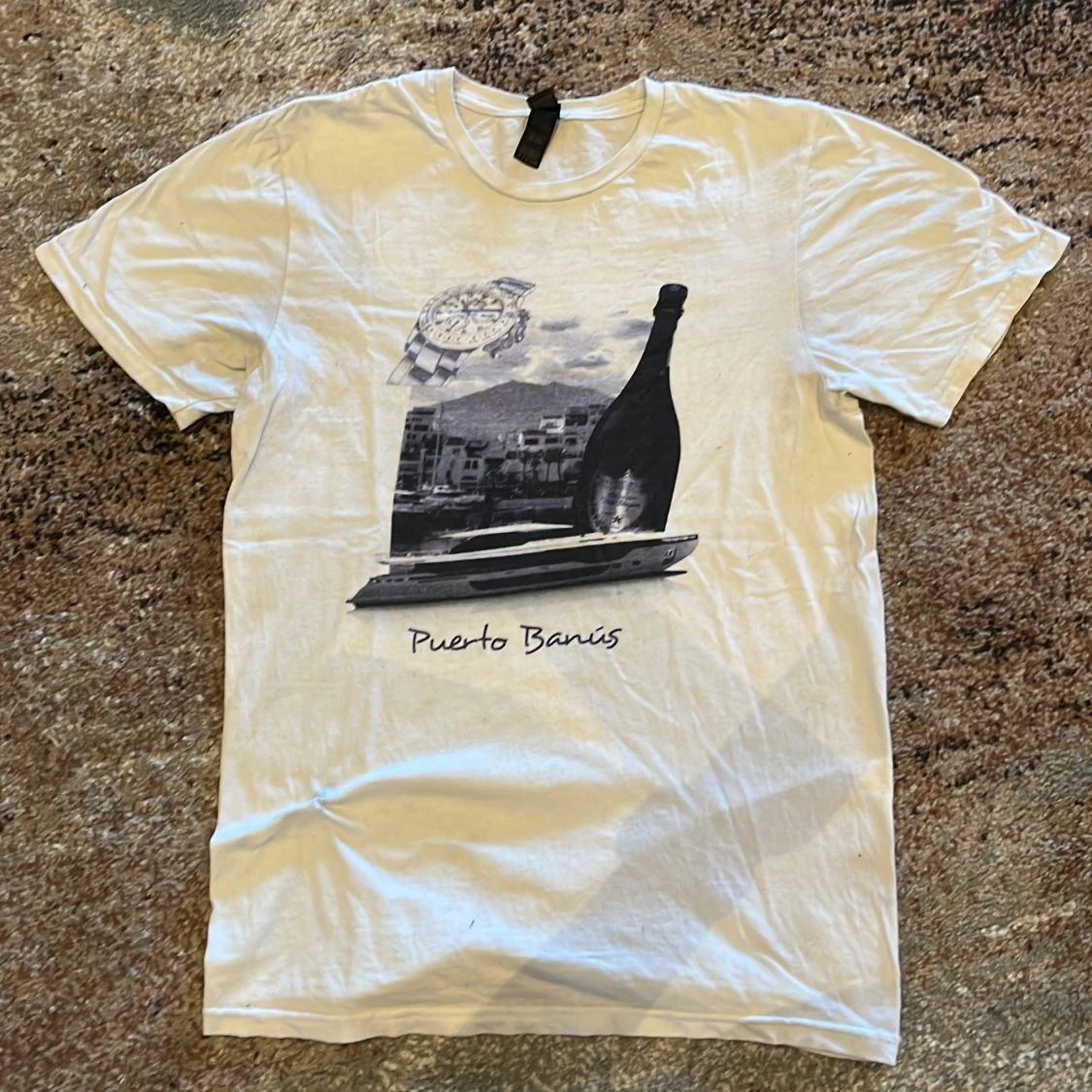 Snygg vit t-shirt med stilrent tryck på framsidan som visar en klocka, champagneflaska, yacht och texten 'Puerto Banús'. Klassisk rund hals och korta ärmar, perfekt för chill dagar. Materialet är mjuk bomull.