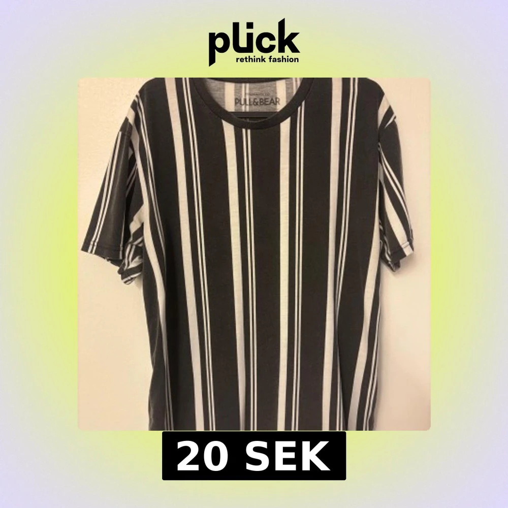 Svart och vit randig t-shirt från Pull&Bear i storlek M. Klassisk rund halsringning och korta ärmar. Snyggt vertikalt mönster som ger en clean och modern vibe. Perfekt för dig som gillar streetstyle och enkel design.