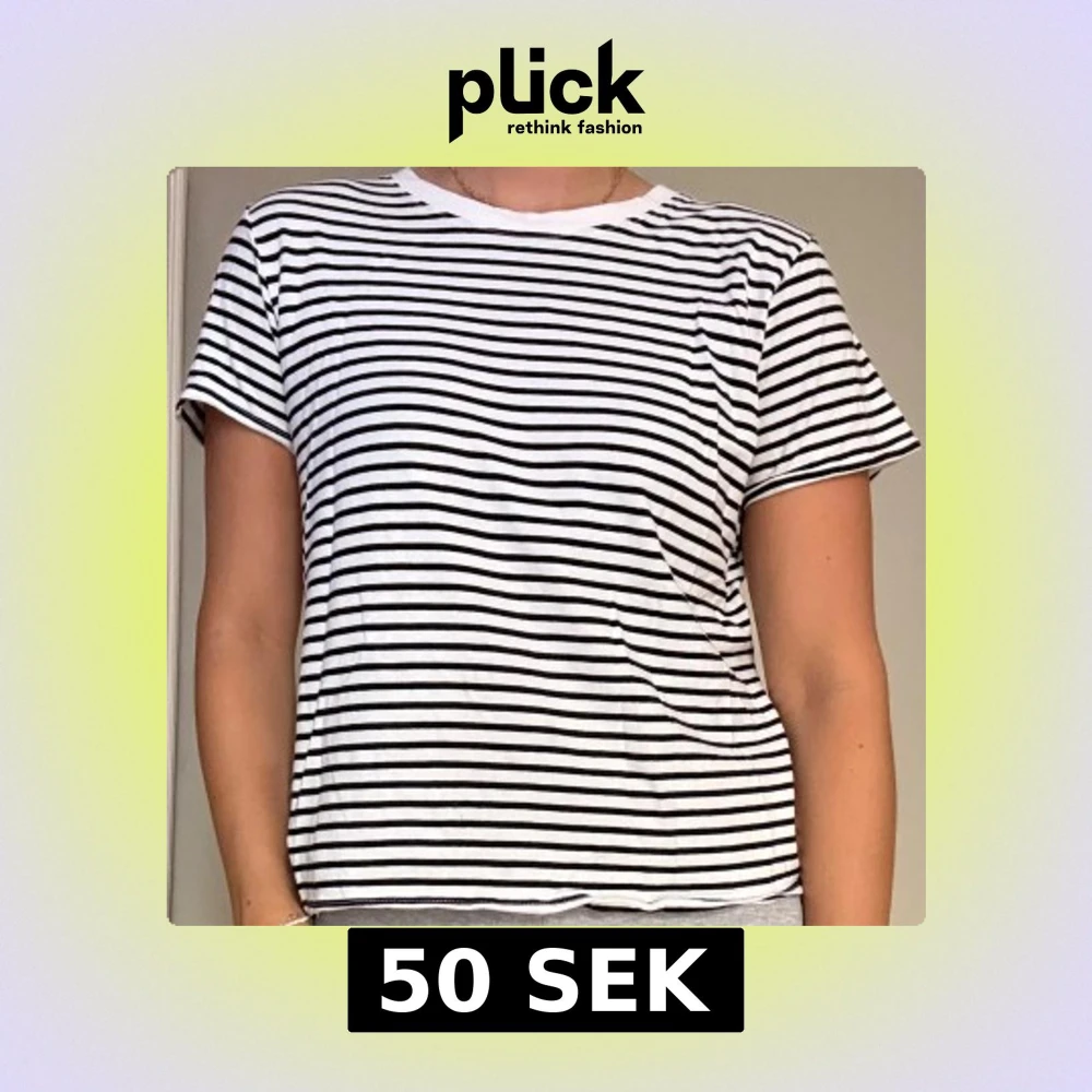 Säljer en klassisk t-shirt med svarta och vita horisontella ränder. T-shirten har korta ärmar och rund halsringning. Den är i en avslappnad passform och tillverkad i mjukt bomullstyg, perfekt för en chill och enkel stil.