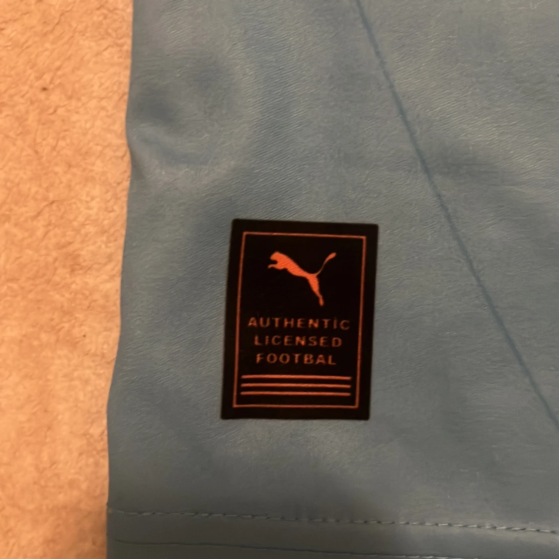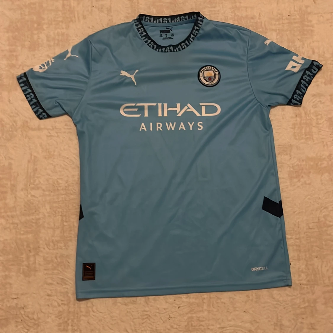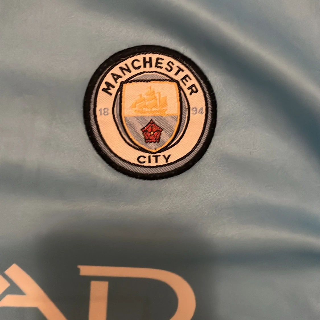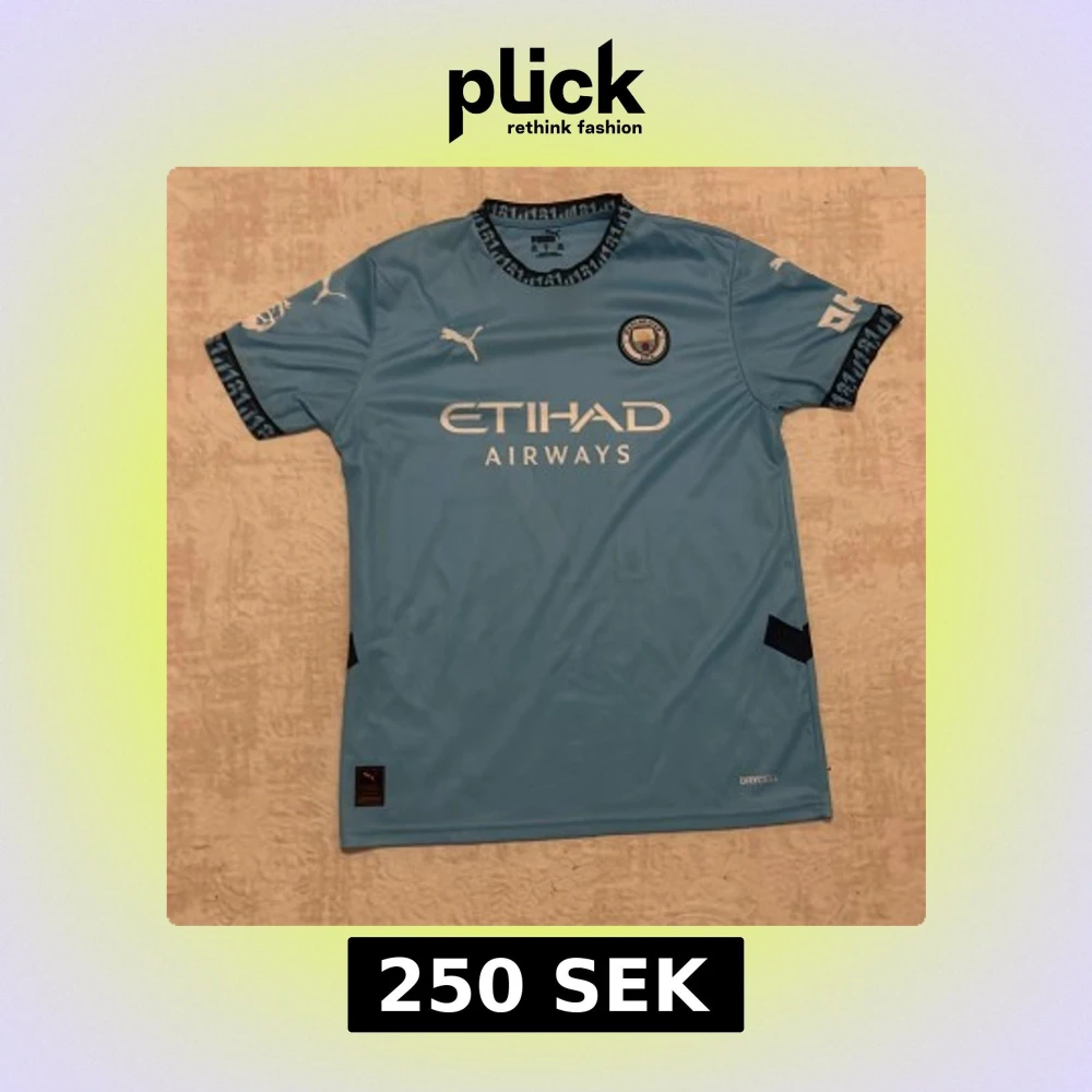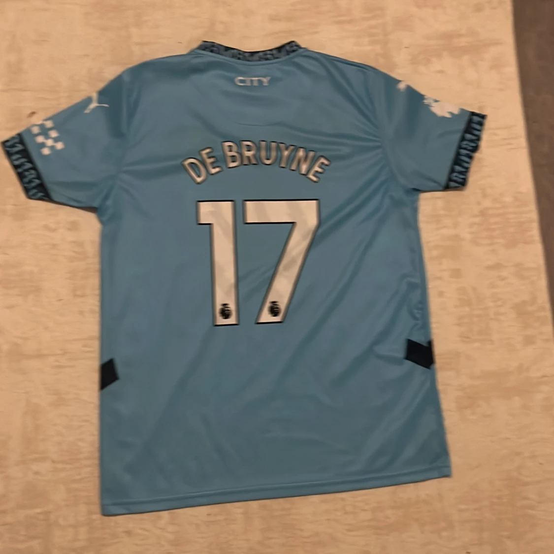 Manchester City matchtröja från Puma med De Bruyne och nummer 17 på ryggen. Tröjan är ljusblå med vita detaljer, klubbmärke på bröstet och Etihad Airways som sponsor. Tillverkad i lätt funktionsmaterial med korta ärmar och autentiska detaljer.