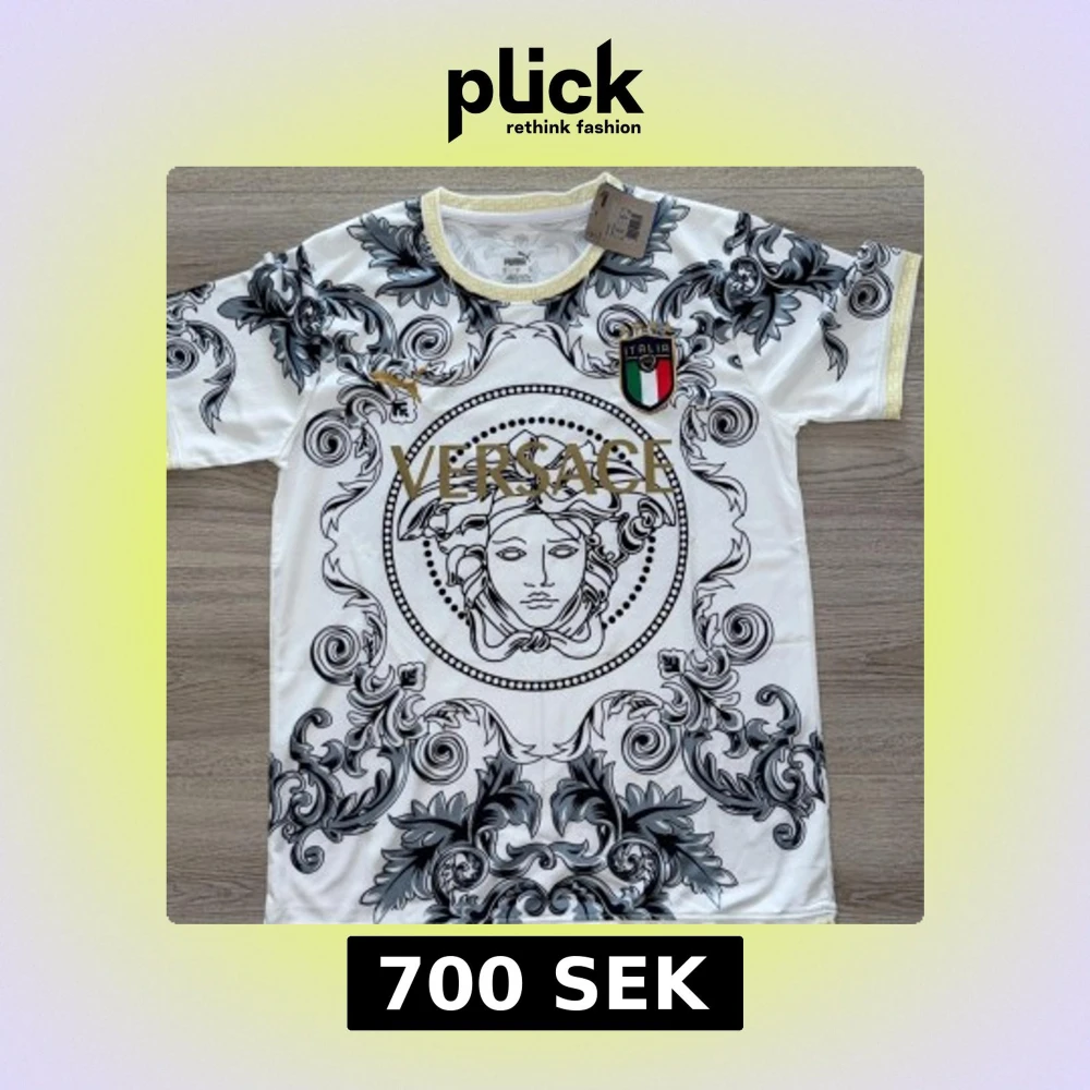 Unik vit fotbollströja med detaljerat barockmönster i svart och grått samt Italiens landslagsemblem på bröstet. Guld Puma-logga och gul dekor runt kragen. Materialet är lätt och andas, perfekt för match eller streetwear.