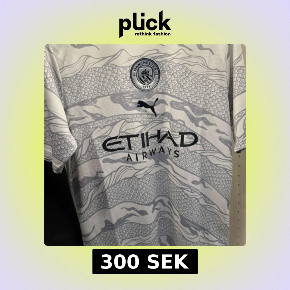 Snygg Manchester City bortatröja från Puma i vitt med ljusgrått drakmönster. Kortärmad modell med klubbmärke och Puma-logga på bröstet samt Etihad Airways som sponsortryck. Perfekt för fotbollsfans!