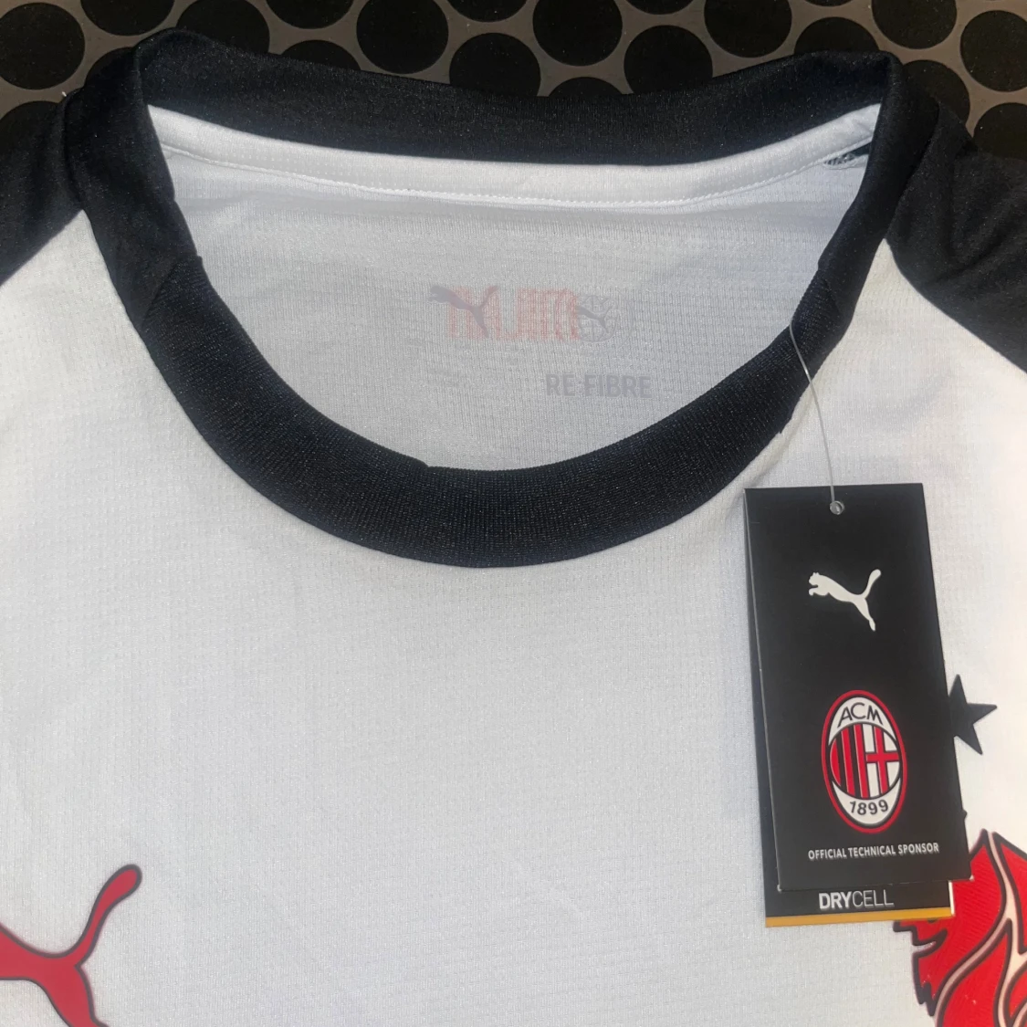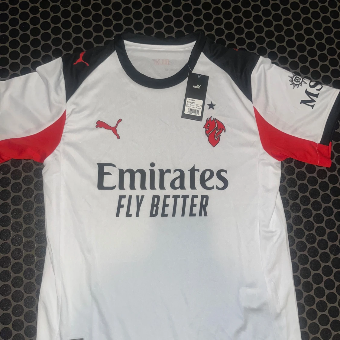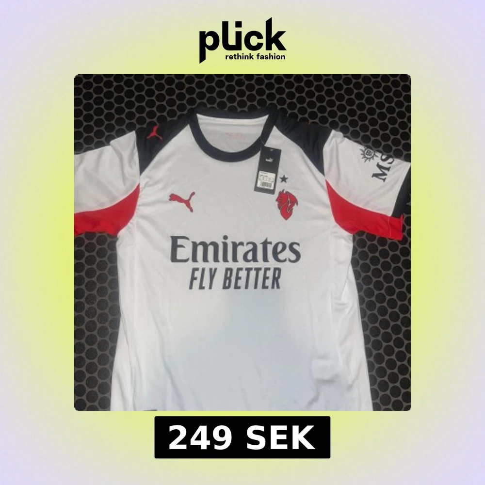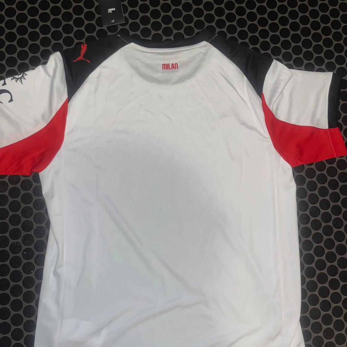 AC Milan bortatröja från Puma i vitt med svarta och röda detaljer. Tröjan har korta ärmar, svart krage och är tillverkad i tekniskt funktionsmaterial (Drycell). Tryck med Emirates Fly Better och klubbmärke på bröstet. Perfekt för fotbollsfans. Bara höra av er vid frågor/funderingar Fraktar samma dag som köp🚚