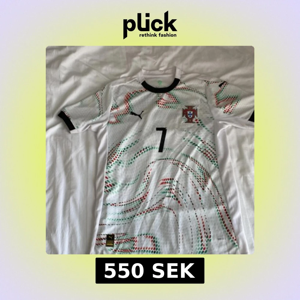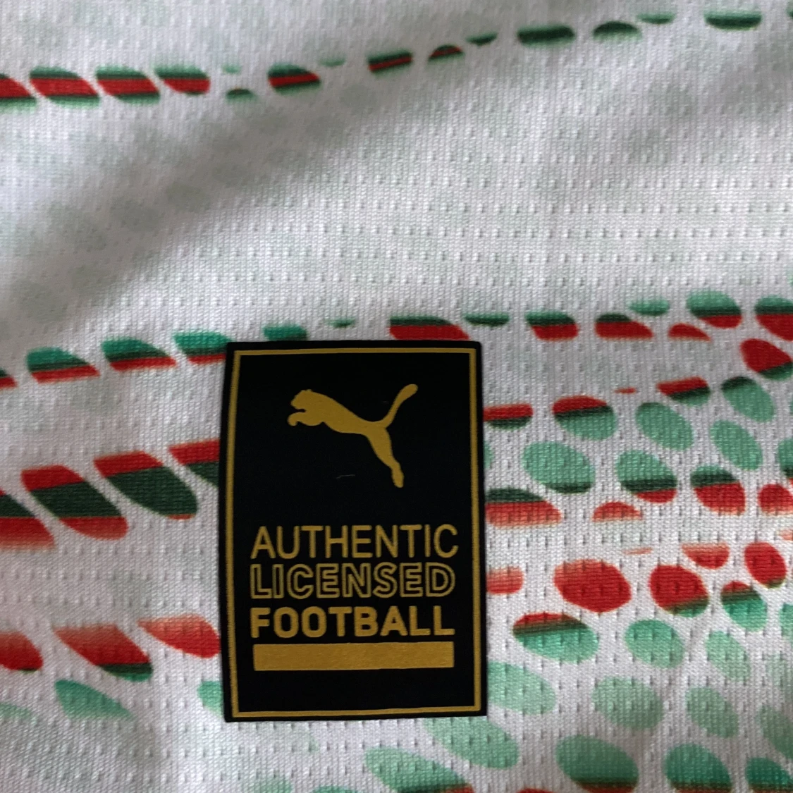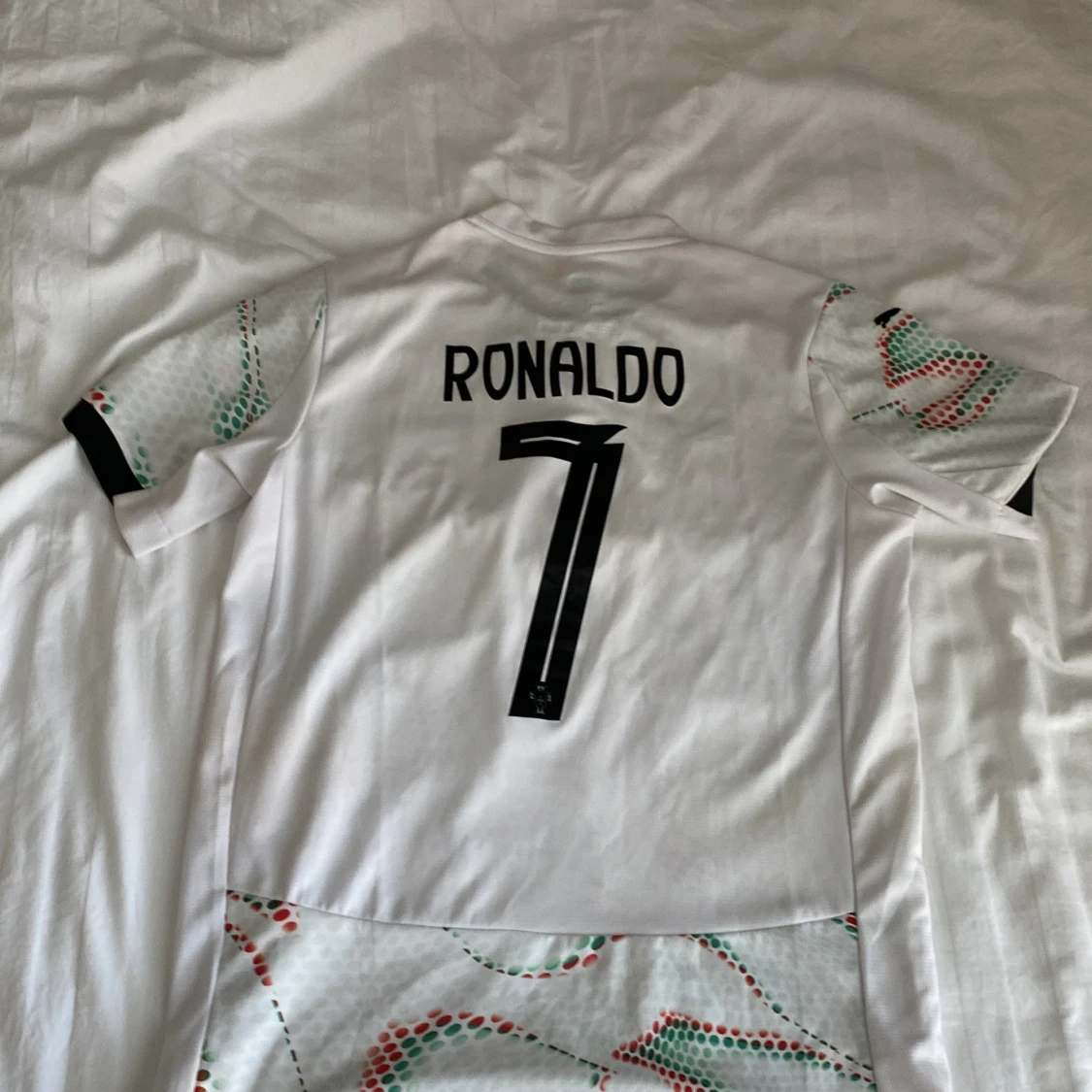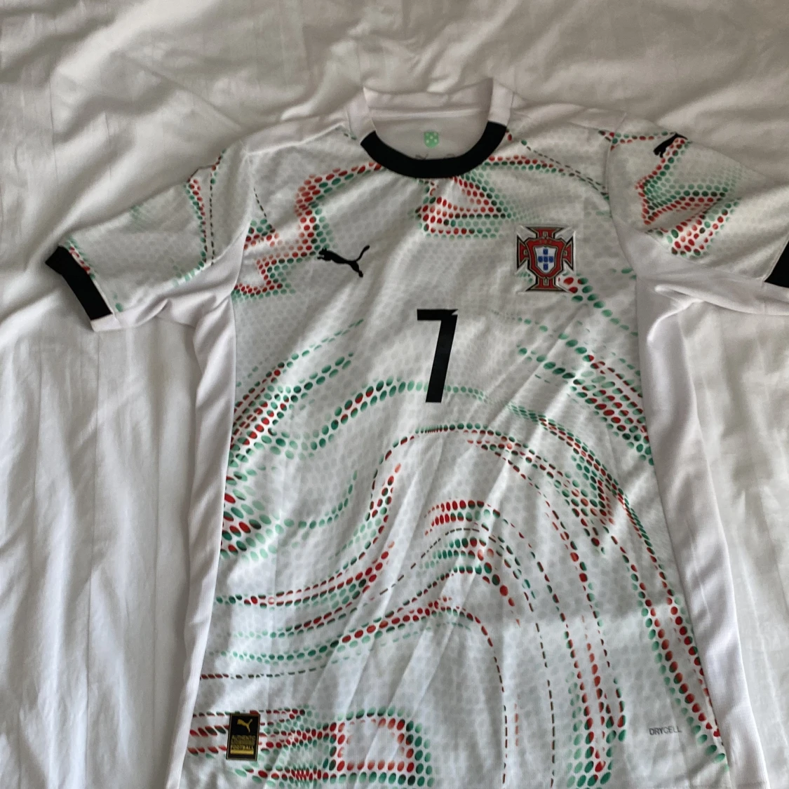 Portugal fotbollströja med Ronaldo och nummer 7. Vit bas med gröna och röda prickiga mönster, svart krage och detaljer. Puma-logga på bröstet och officiellt klubbmärke. Tillverkad i lätt och ventilerande material, perfekt för match eller träning. Kan passa på folk som har storlek S också.