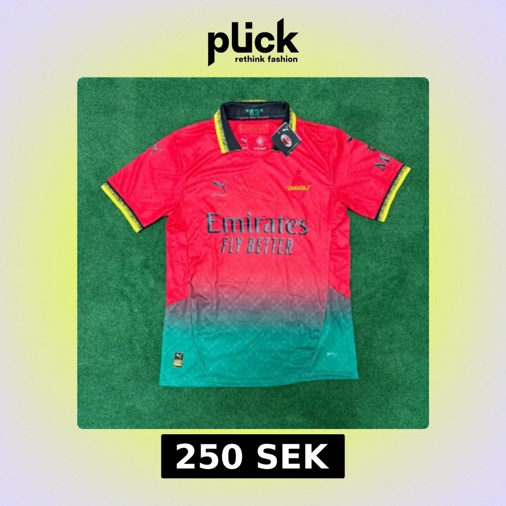 Snygg AC Milan fotbollströja från Puma med röd överdel och grön nedre del i snygg fade. Tröjan har gula detaljer på krage och ärmslut, samt tryck med 'Emirates Fly Better' och 'Diavoli'. Klassisk kortärmad modell i lätt funktionsmaterial.