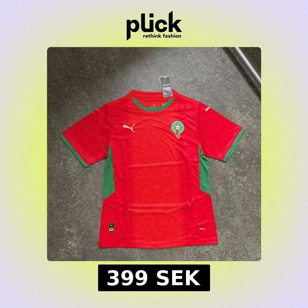Officiella Marocko-tröjan från Puma, som användes under VM. Stark röd färg med gröna detaljer och stjärnmönster i tyget. Perfekt för fans, samlare eller som stilren statement-tröja. 🧼 Nyskick 📏 Storlek: 1M 🔥 Modern passform & hög kvalité