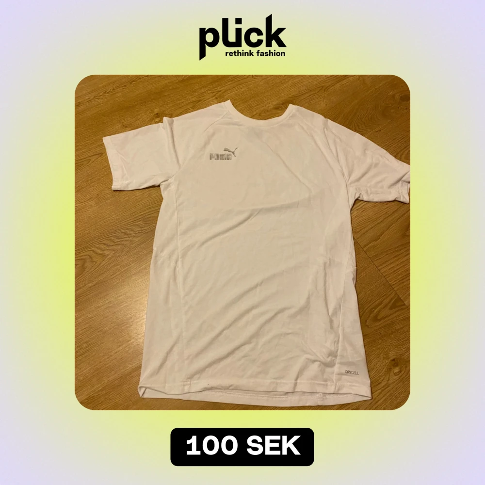 Säljer en vit t-shirt från Puma i storlek S. Den är i bomull och har en klassisk passform med korta ärmar. Perfekt för vardagsbruk eller träning. Puma-loggan syns diskret på bröstet. Skön och enkel stil som passar till det mesta!