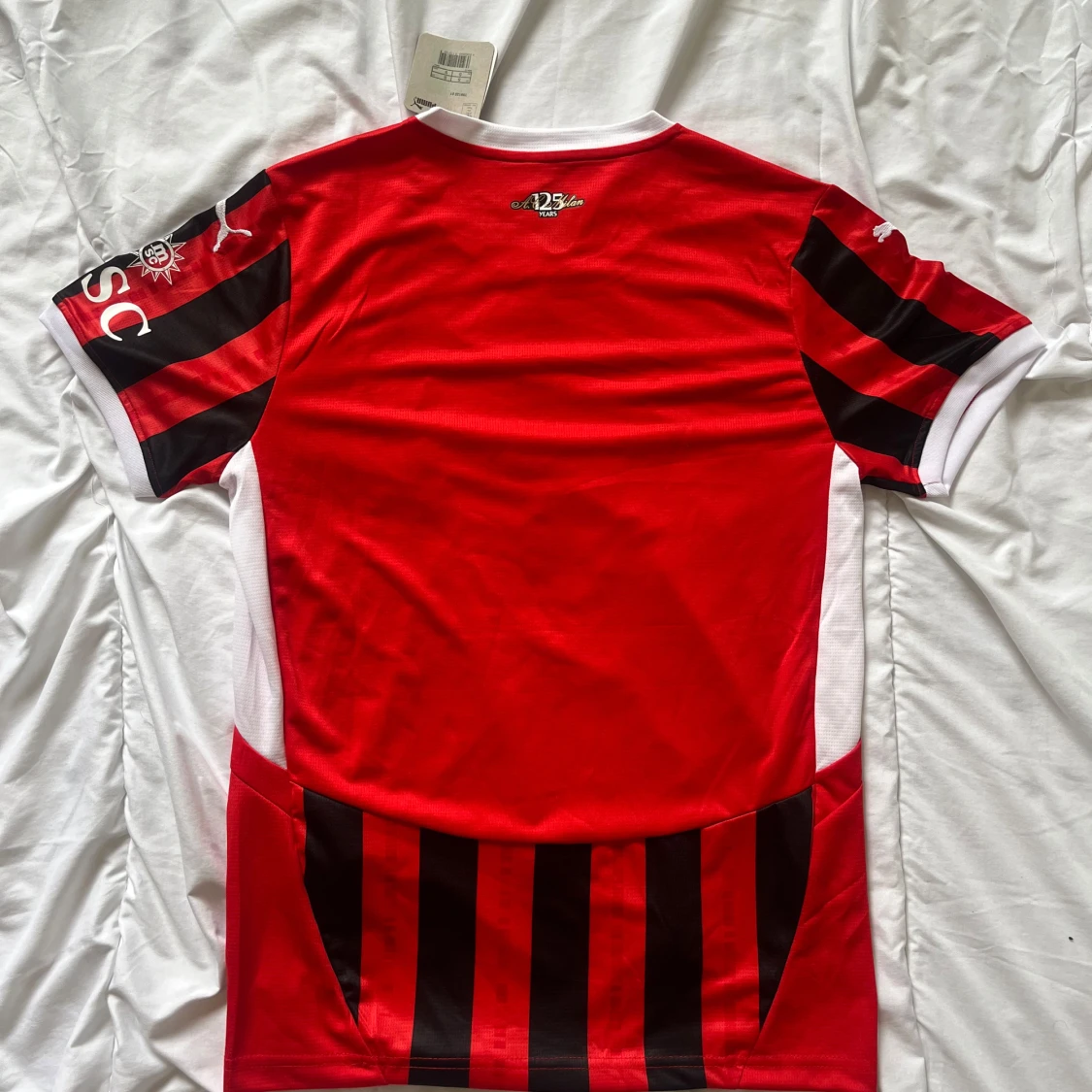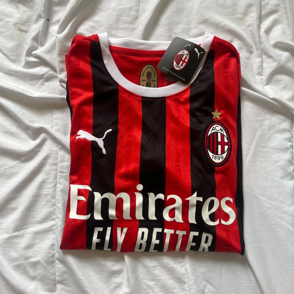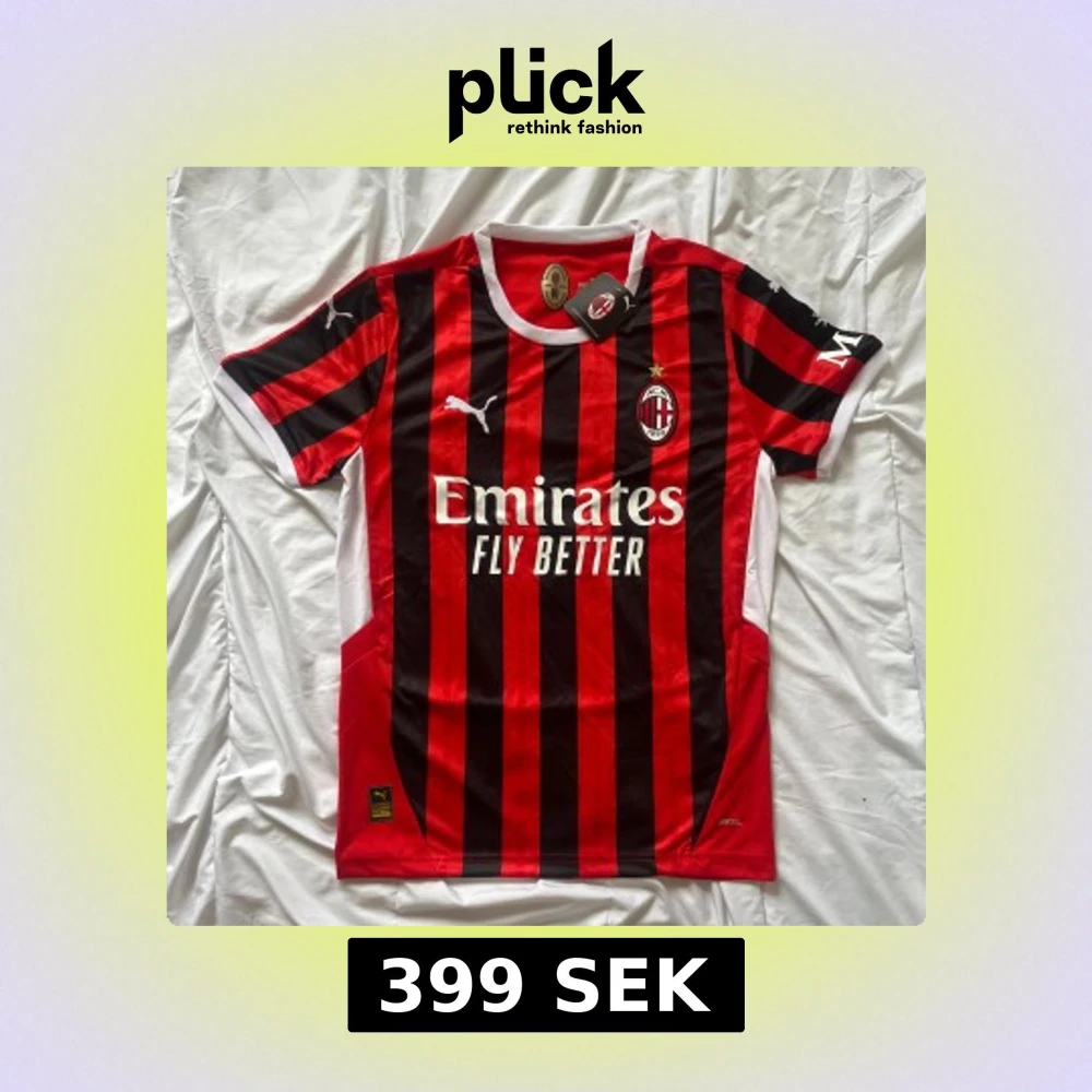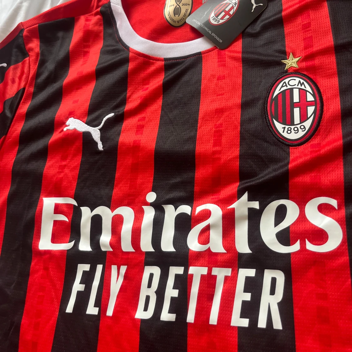 Säljer en klassisk AC Milan fotbollströja från Puma med röda och svarta vertikala ränder, vita detaljer och klubbmärke på bröstet. Tröjan har sponsortryck från Emirates och MSC samt vit krage och ärmslut.
