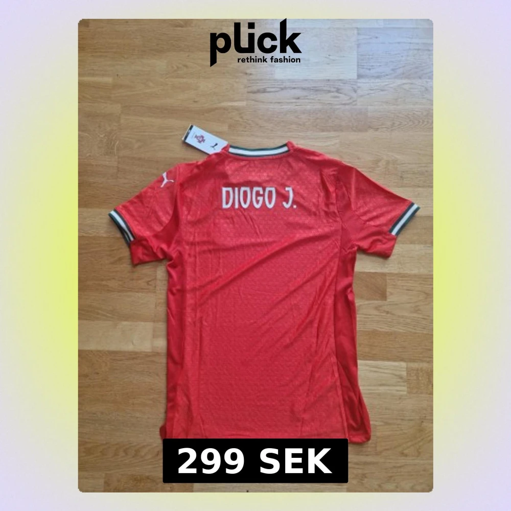 Portugal fotbollströja med Diogo J. på ryggen, officiell Puma-modell. Röd med vita detaljer, broderad landslagssköld och Puma-logga. Kortärmad, lätt och ventilerande material med subtilt mönster och ribbade muddar i vitt och grönt.