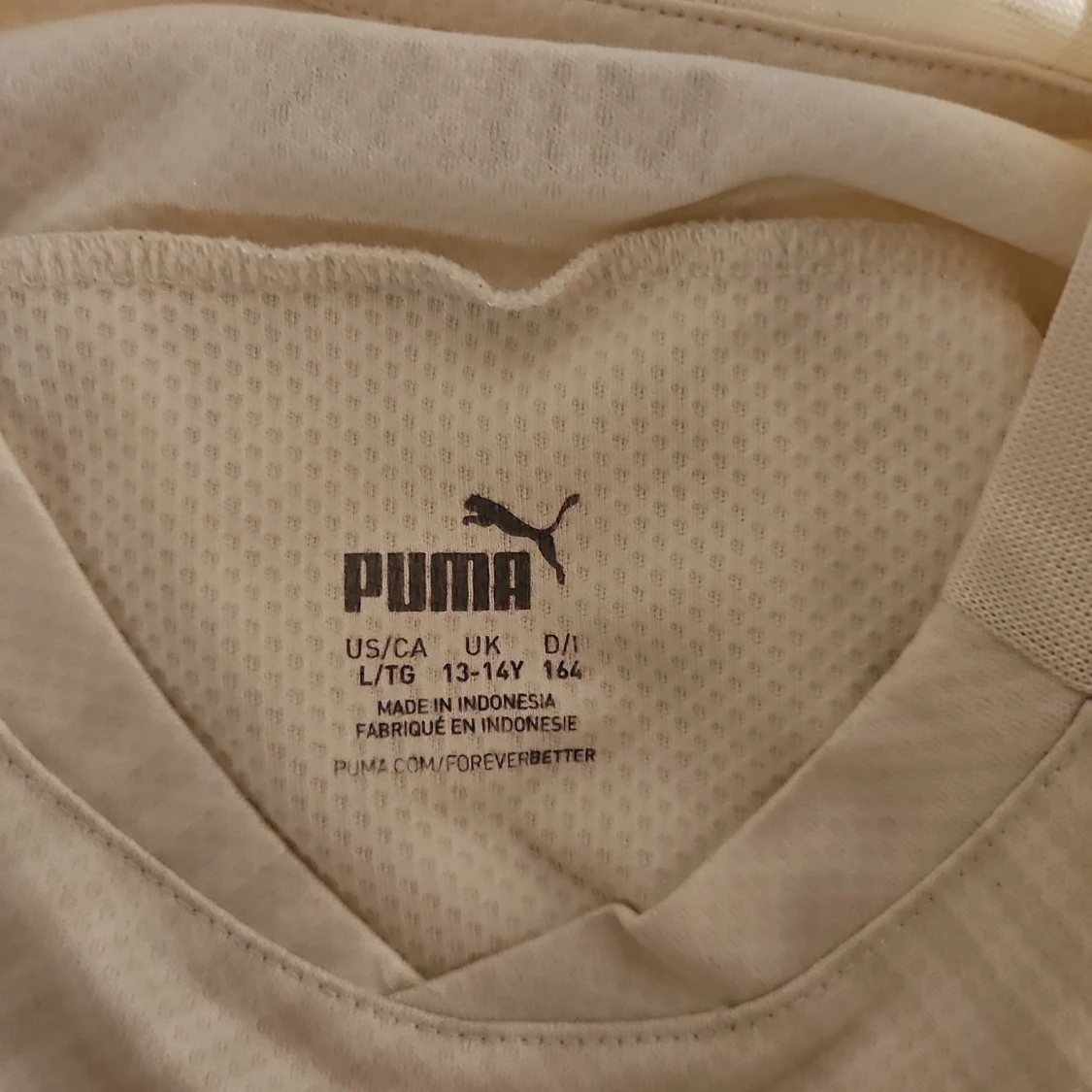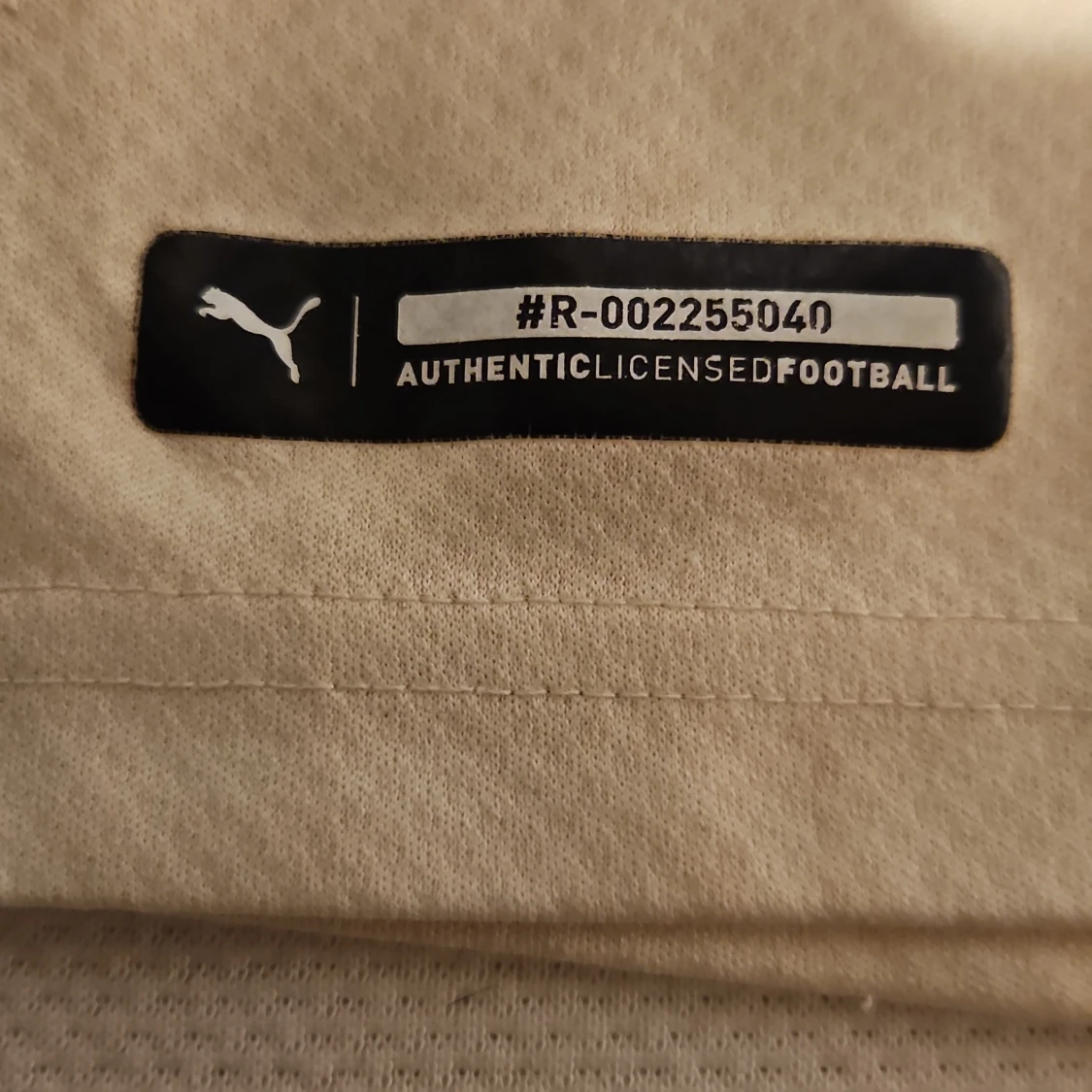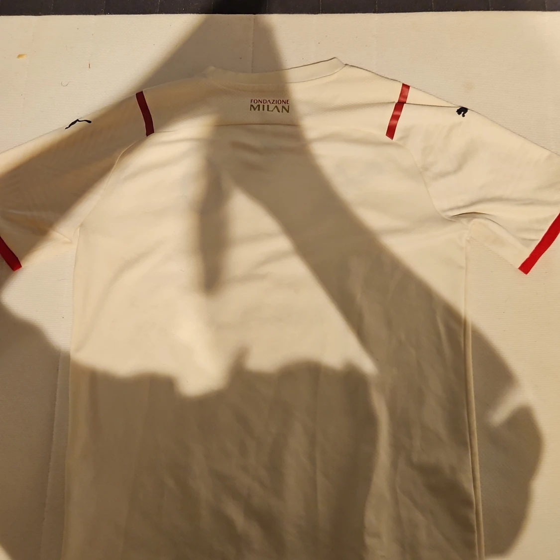 AC Milan officiell matchtröja från Puma i ljus beige med röda detaljer och klubbmärke på bröstet. Tröjan har korta ärmar, rund hals och ventilerande meshpaneler. Materialet är lätt och andas, perfekt för fotboll. Emirates sponsortryck på framsidan. Den har lite skador på magen som man kan se på sista bilden och en fett fläck men annars är tröjan i bra skick.