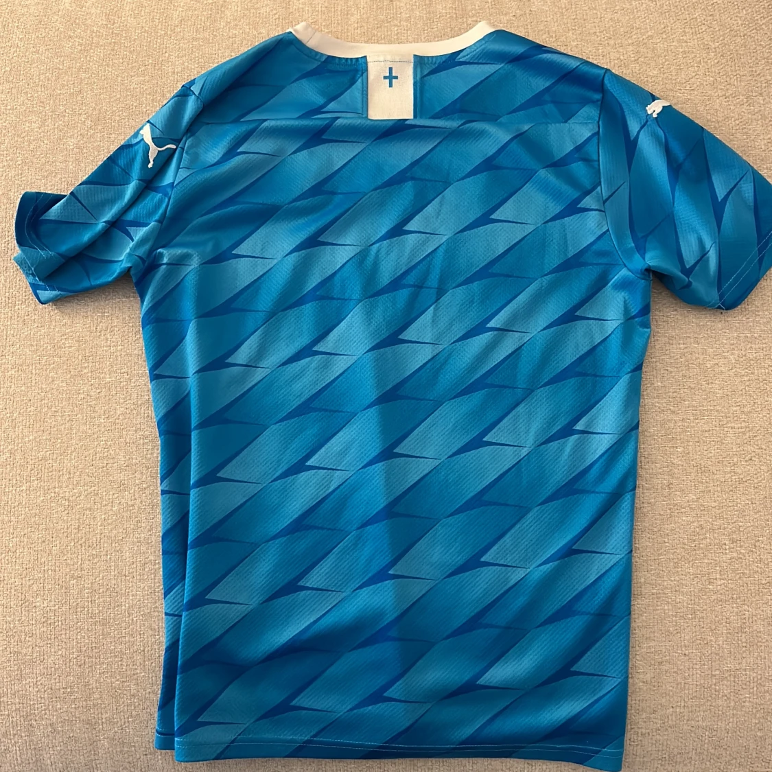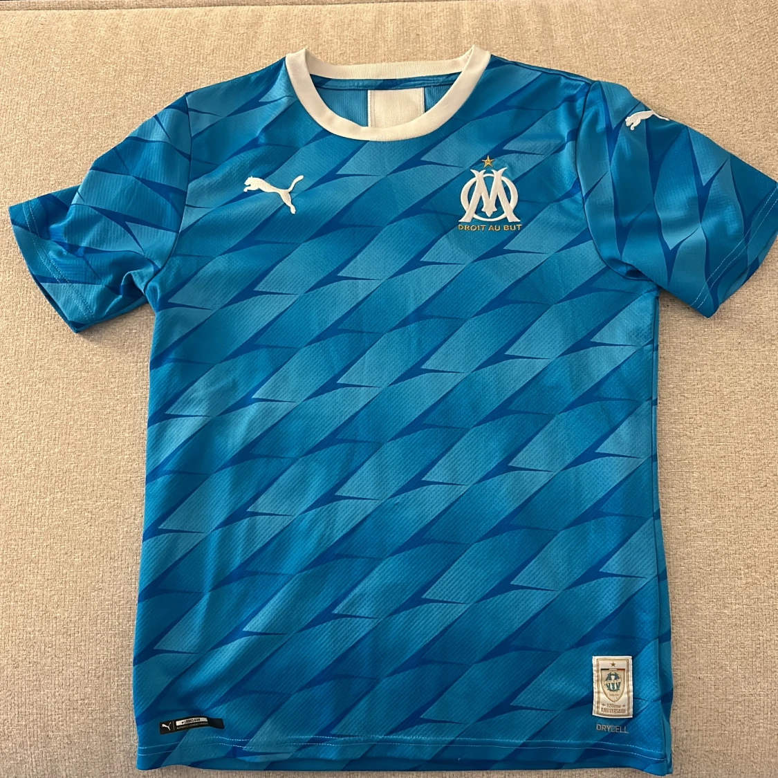 Snygg blå fotbollströja från Puma med Olympique de Marseille-logga på bröstet och vit krage. Tröjan har ett randigt mönster i olika blå nyanser och korta ärmar. Tillverkad i lätt och ventilerande polyester, perfekt för träning eller match.