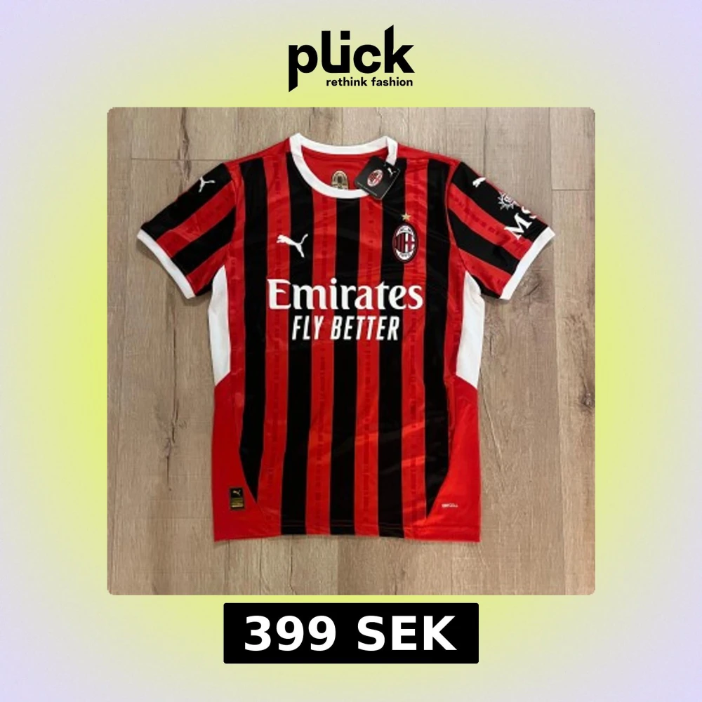 AC Milan officiell matchtröja från Puma i storlek S. Tröjan har klassiska röda och svarta vertikala ränder, vit krage och detaljer, samt klubbmärke och sponsortryck på bröstet. Tillverkad i lätt och ventilerande polyester, perfekt för träning eller match.