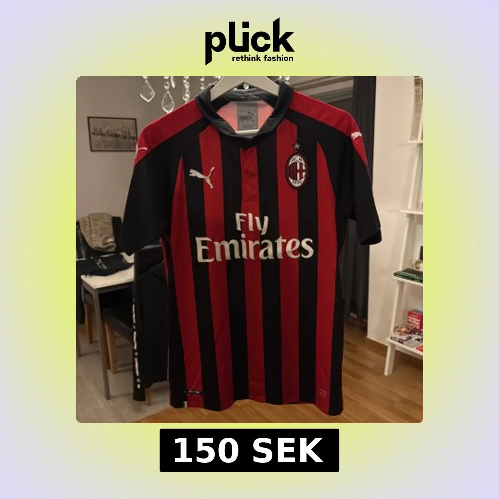 AC Milan matchtröja från säsongen 2018/19 med klassiska röda och svarta vertikala ränder, korta ärmar och broderade Puma-loggor. Materialet är lätt och ventilerande polyester. Serie A och Champions League-märken på ärmarna samt Fly Emirates tryck på bröstet.
