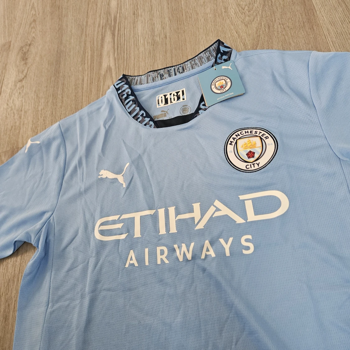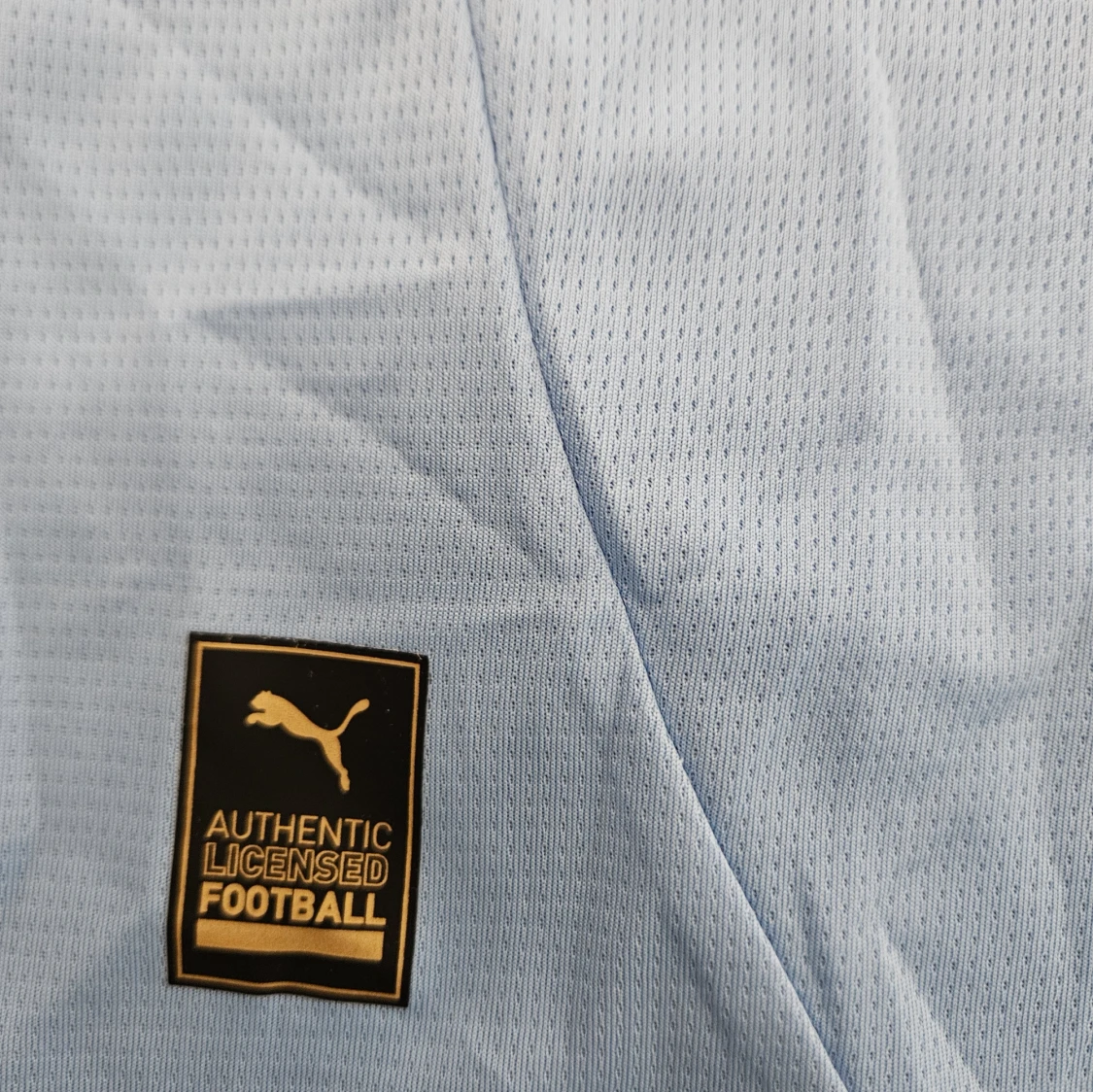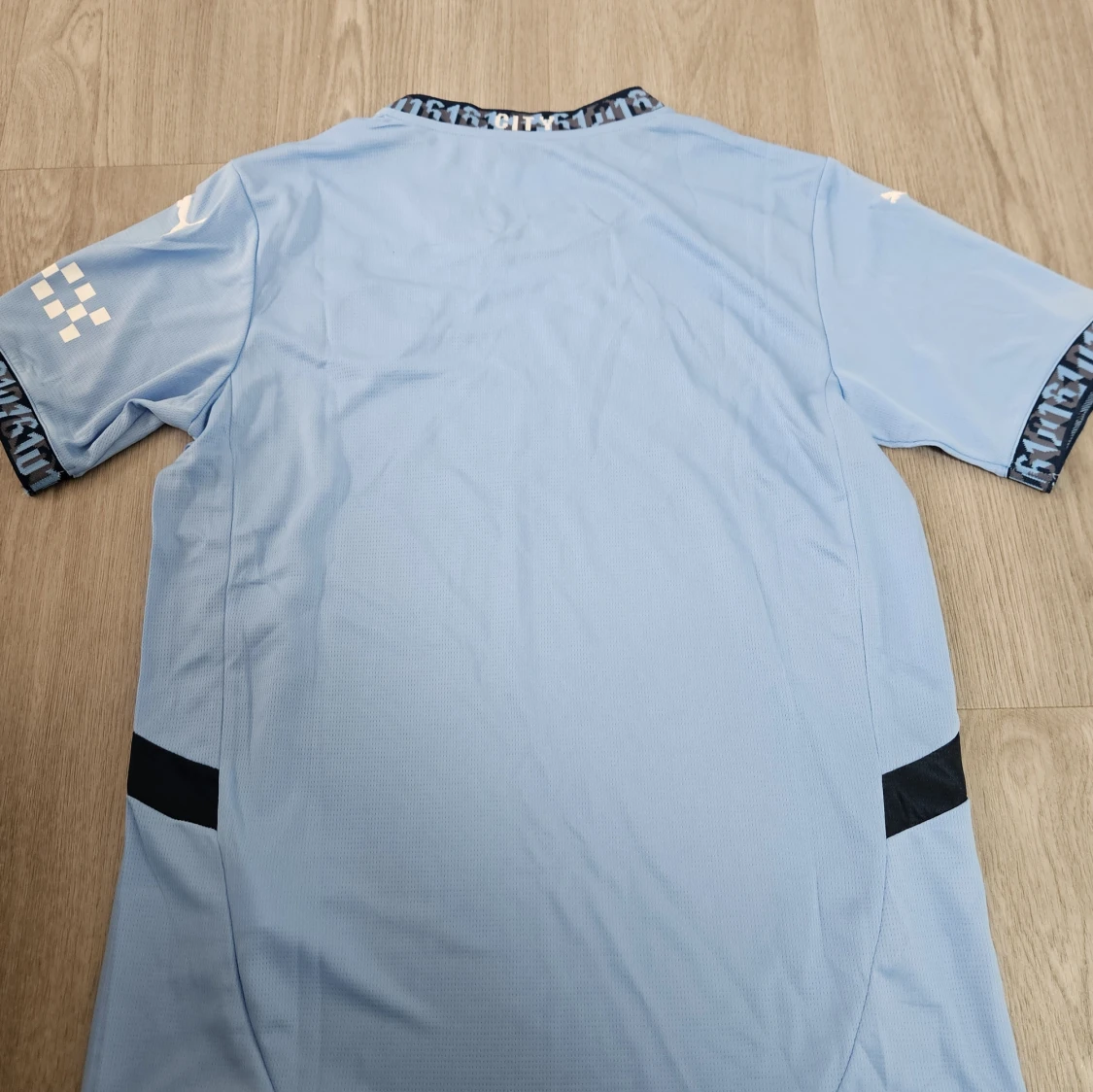 Säljer en ljusblå Manchester City fotbollströja från Puma med klubbmärke och Etihad Airways-tryck på bröstet. Tröjan har korta ärmar, svart detalj på sidorna och mönstrad krage. Tillverkad i lätt och ventilerande material.