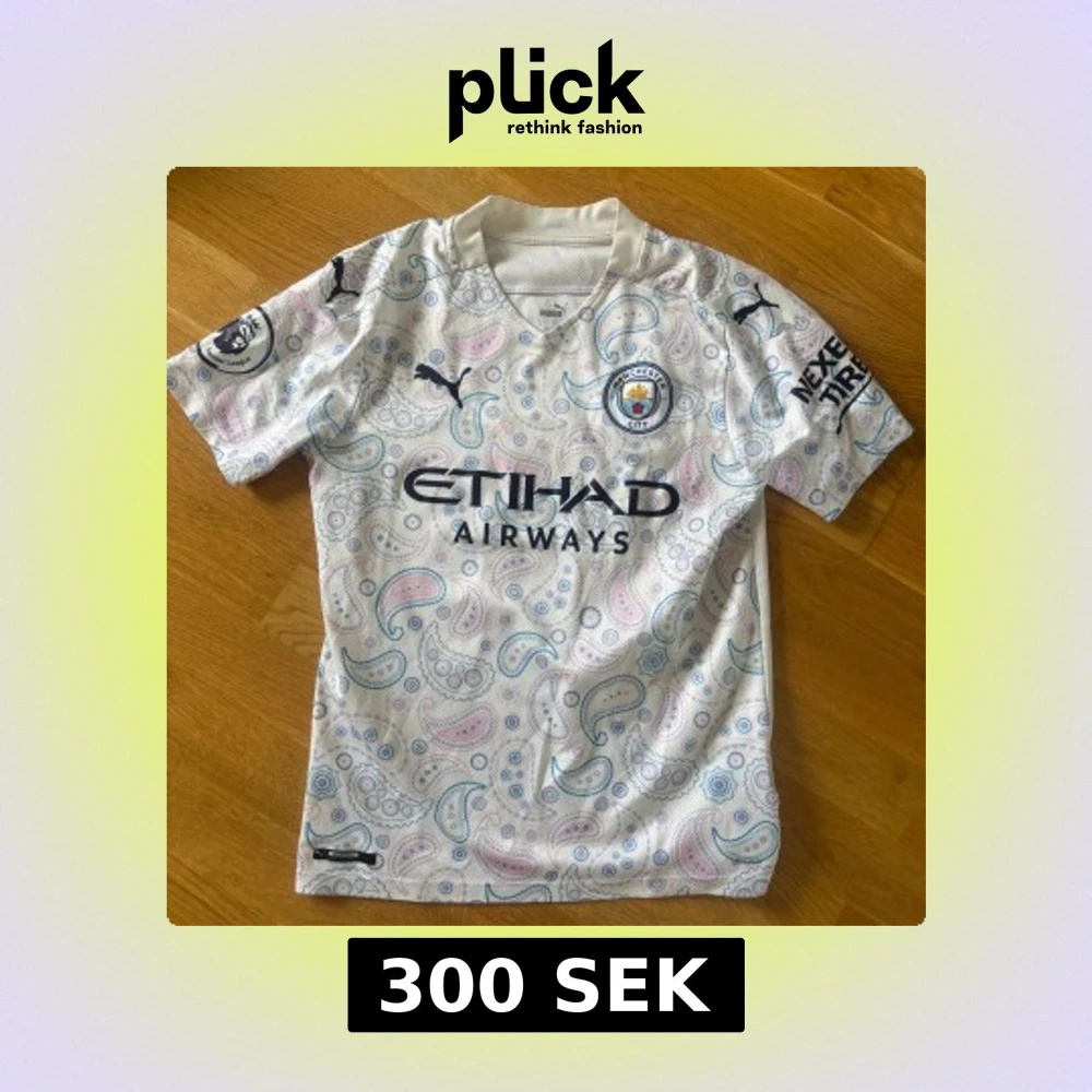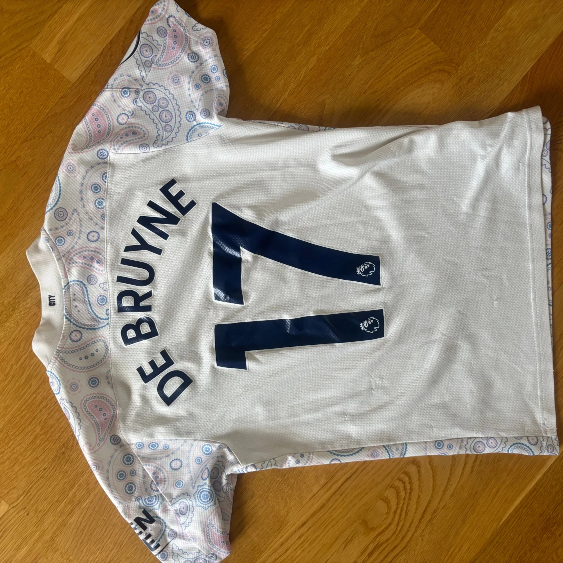 Manchester City bortatröja från Puma med De Bruyne och nummer 17 på ryggen. Tröjan är vit med paisleymönster i ljusblått och ljusrosa, korta ärmar och broderade klubb- och sponsorloggor. Tillverkad i lätt och ventilerande material, perfekt för match eller träning.