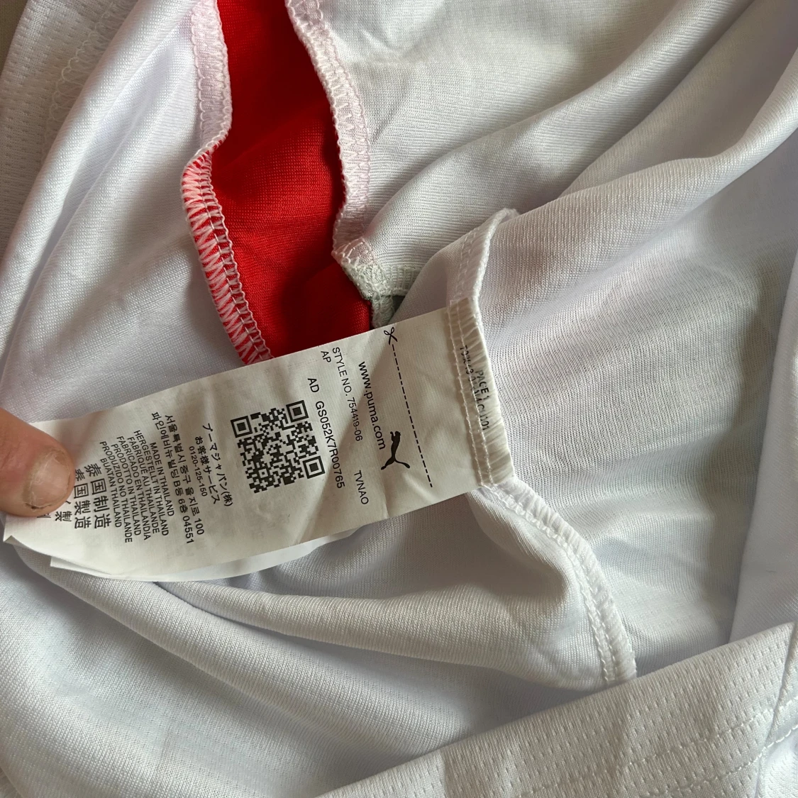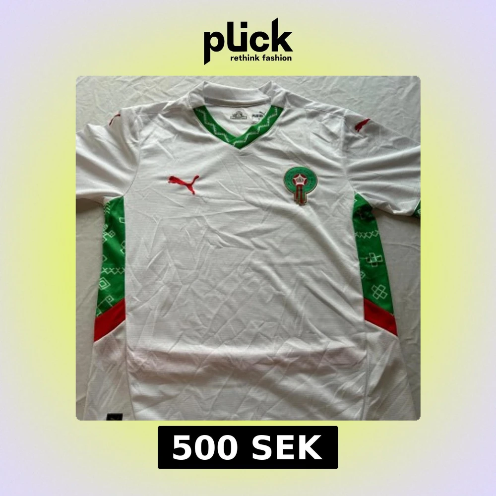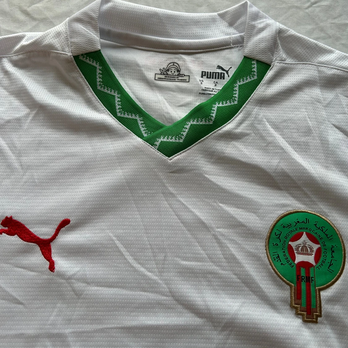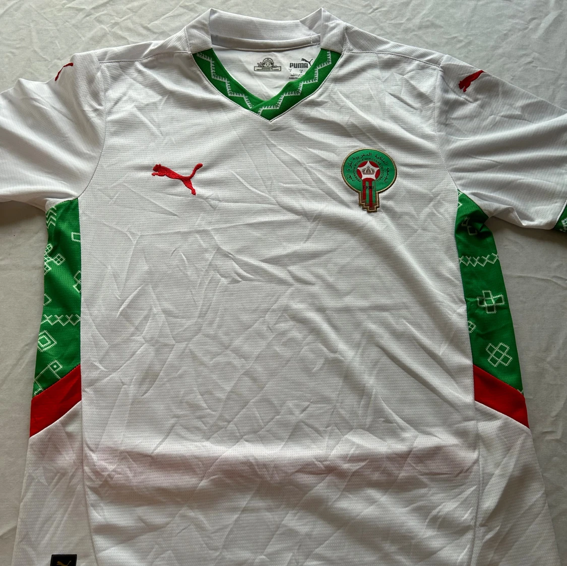 Marockos officiella fotbollströja Puma i vitt med gröna och röda detaljer. Tröjan har korta ärmar, grönt mönster längs sidorna och halsen, samt broderad landslagsemblem och Puma-logga. Tillverkad i lätt och ventilerande polyester.