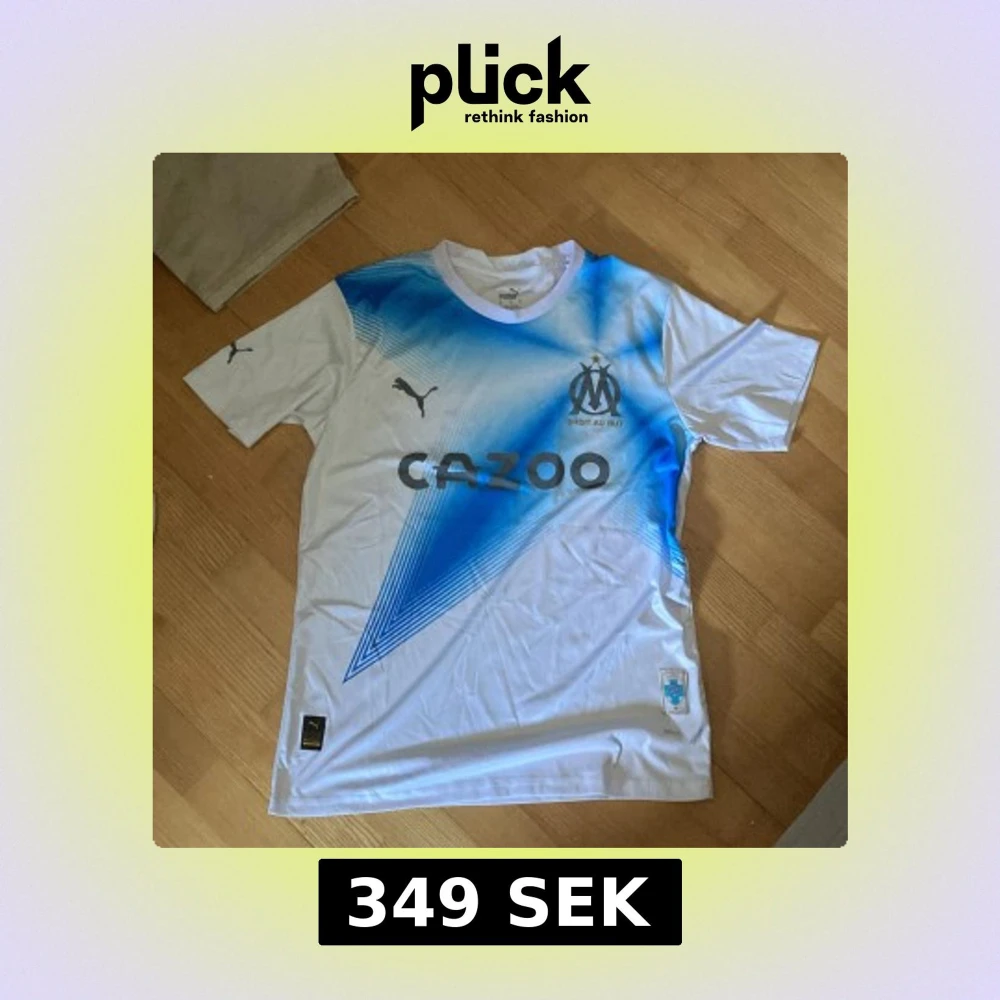 Olympique de Marseille matchtröja från Puma i vitt med blått grafiskt mönster över bröstet. Tryckt klubbmärke, sponsorlogga och Puma-loggor på ärmarna. Tillverkad i lätt och ventilerande material, perfekt för fotboll eller supporterliv.