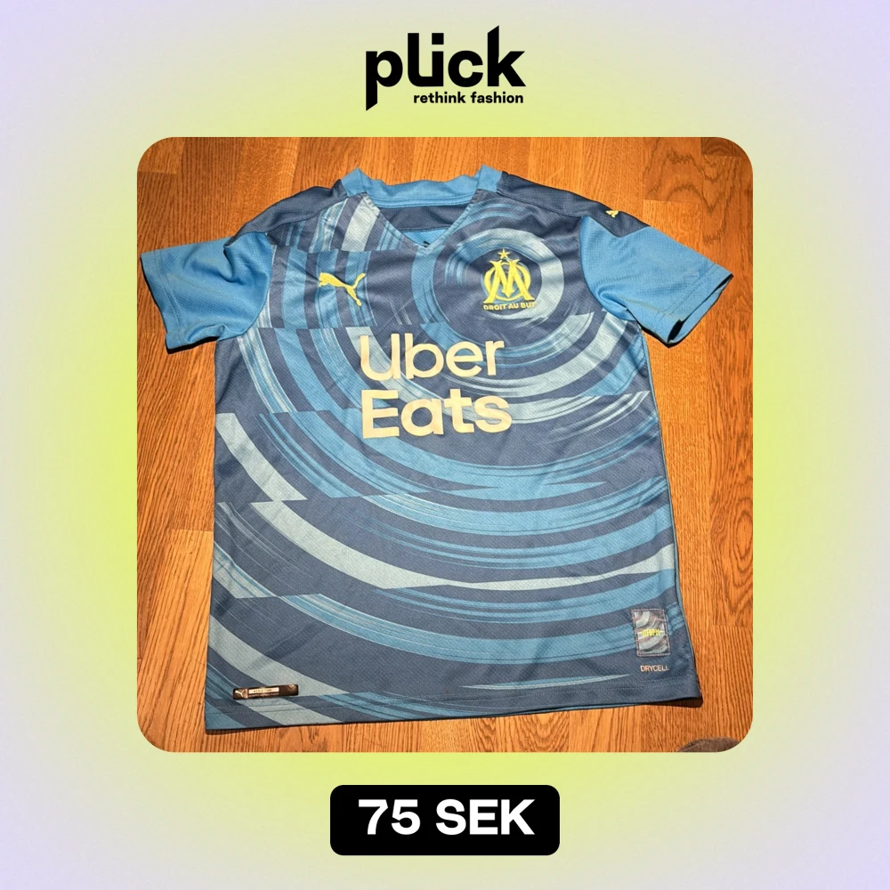 Säljer en snygg blå fotbollströja från Puma med korta ärmar. Tröjan har olika blå nyanser och loggor på bröstet. Perfekt för fotbollsfans eller träning! 🏆