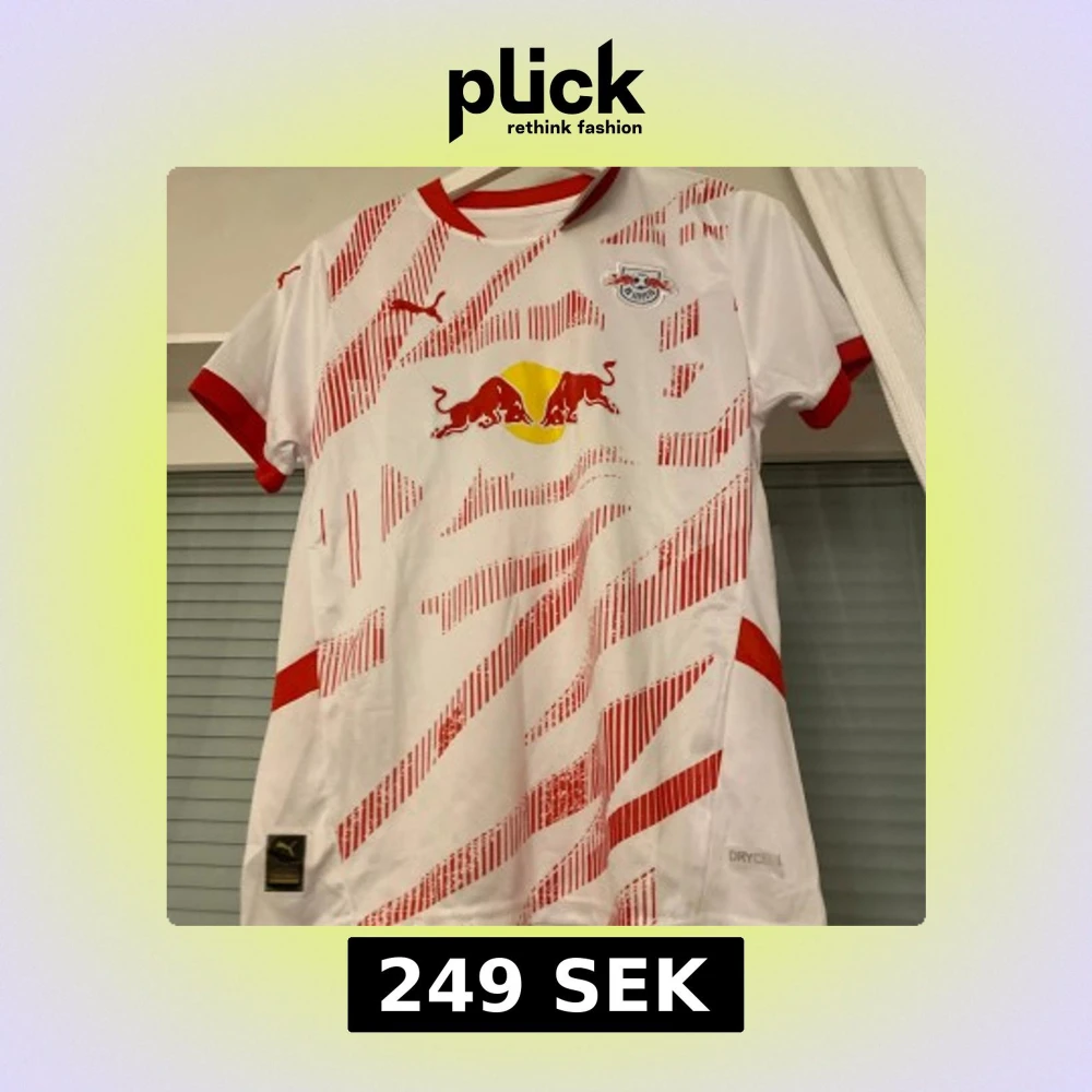 Snygg vit och röd RB Leipzig fotbollströja från Puma med korta ärmar. Tröjan har ett dynamiskt rött mönster och RB Leipzig-logga på bröstet. Perfekt för fans som vill visa sitt stöd med stil! 🏆