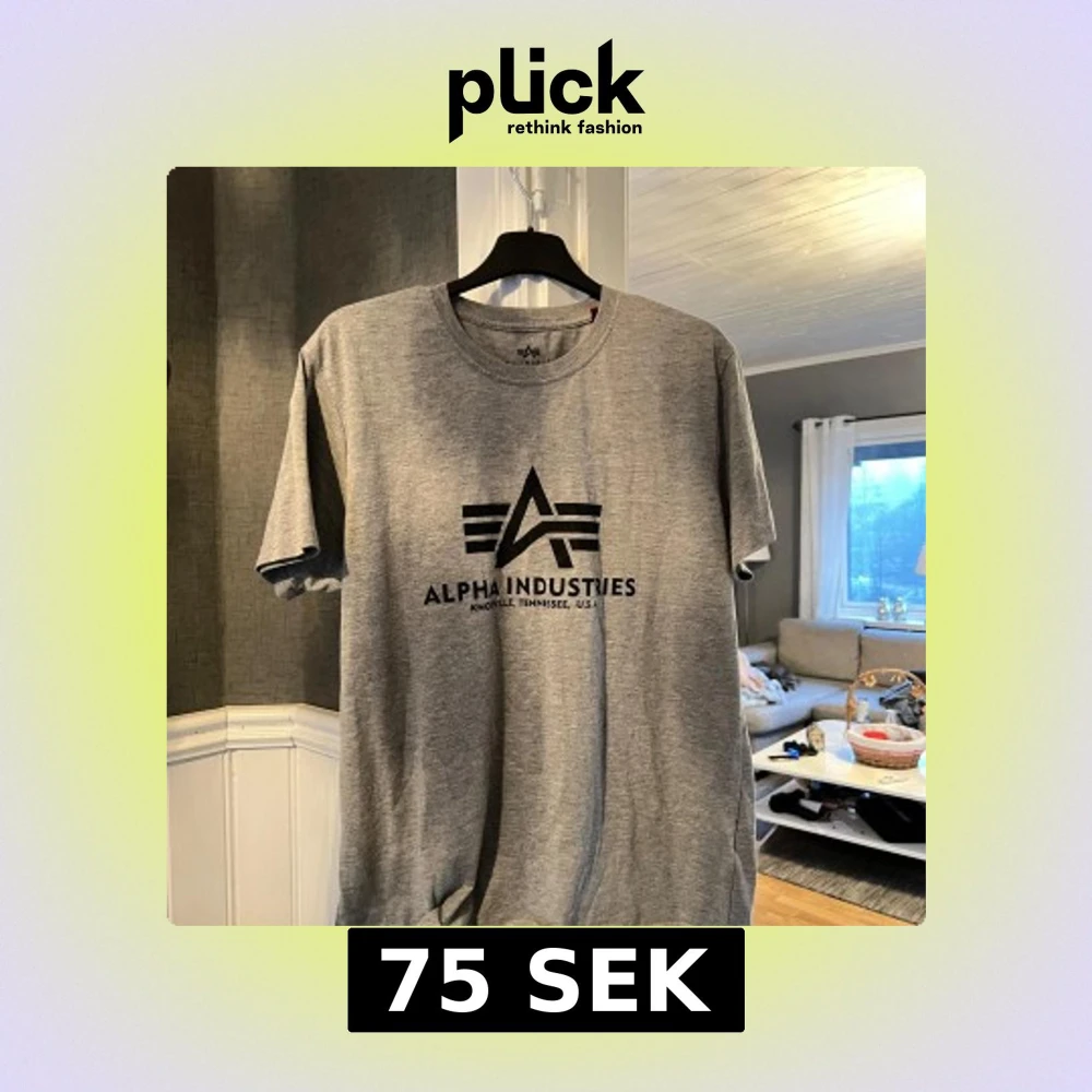 Säljer en grå t-shirt från Alpha Industries med deras ikoniska logga tryckt på framsidan. T-shirten är kortärmad och tillverkad i mjukt material, perfekt för en avslappnad stil.