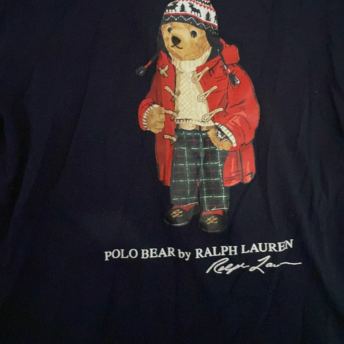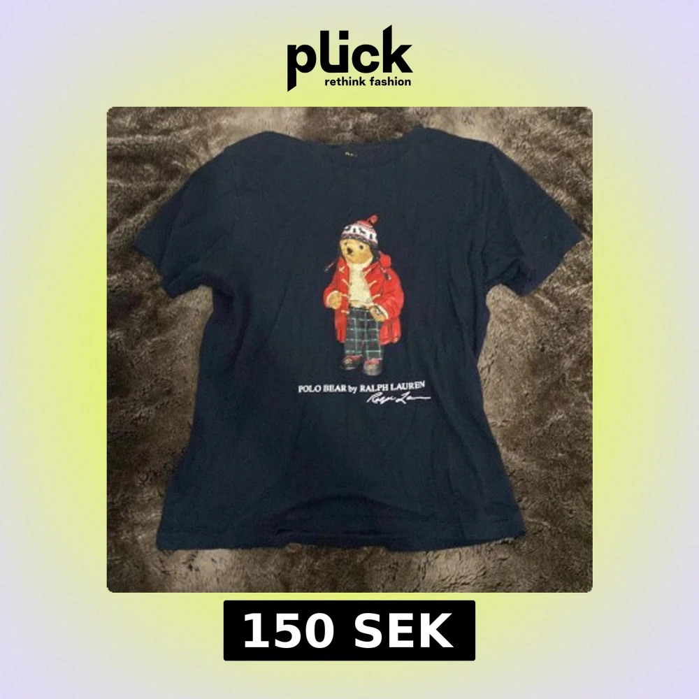 Snygg mörkblå t-shirt från Ralph Lauren med ikoniska Polo Bear-trycket på bröstet. Björnen har röd jacka, stickad tröja och rutiga byxor. Klassisk passform och rund hals. Perfekt för dig som gillar streetstyle och vill sticka ut lite extra. Storleken är medium i barnstorlek så ungefär 12 år! Kom med bud eller frågor.