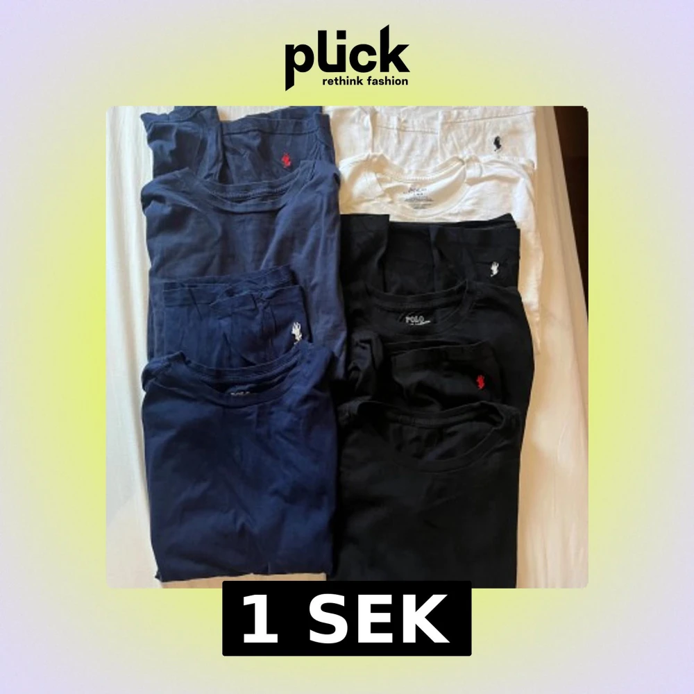 Säljer flera klassiska t-shirts från Polo Ralph Lauren i svart, marinblått och vitt. Alla har den ikoniska broderade loggan på nedre kant . T-shirtsen är kortärmade och gjorda i mjuk bomull, perfekt för en clean och stilren look.