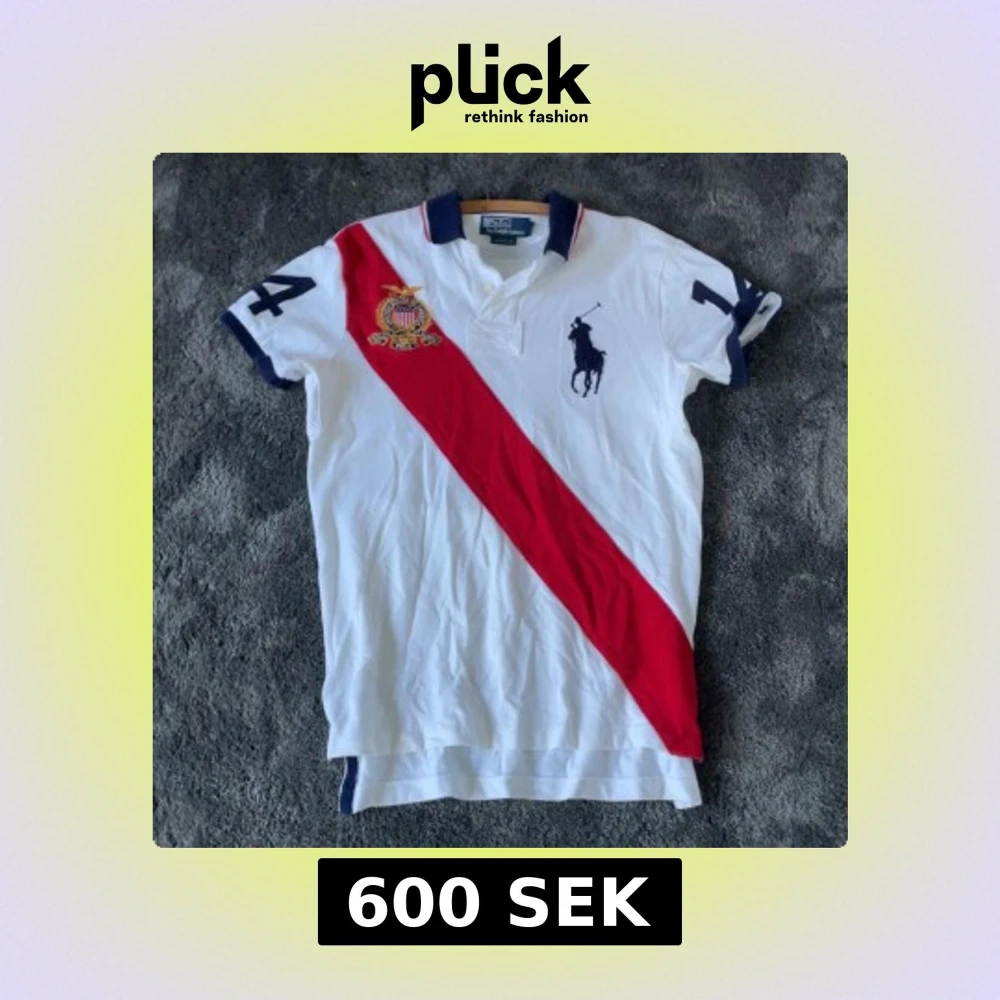 Vit t-shirt från Polo Ralph Lauren med korta ärmar, stor mörkblå polospelare på bröstet, röd diagonal rand och broderad patch. Mörkblå krage med röd/vit kant, stora siffror 14 på rygg och ärmar. Materialet är bomull, perfekt för en sportig look. ”Chief Keef style”