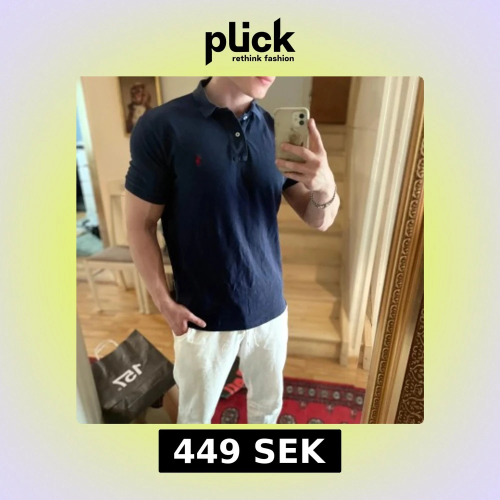 Säljer en klassisk mörkblå pikétröja från Polo Ralph Lauren med röd broderad logga på bröstet. Tröjan har korta ärmar, krage och knappar vid halsen. Perfekt för en stilren och avslappnad look.