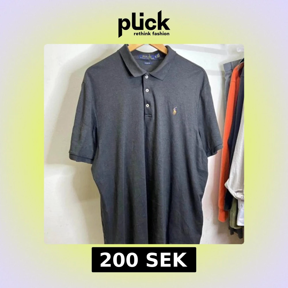 Säljer en klassisk mörkgrå pikétröja från Polo Ralph Lauren med broderad logga på bröstet. Tröjan har krage, tre knappar och korta ärmar. Perfekt för en stilren och avslappnad look.