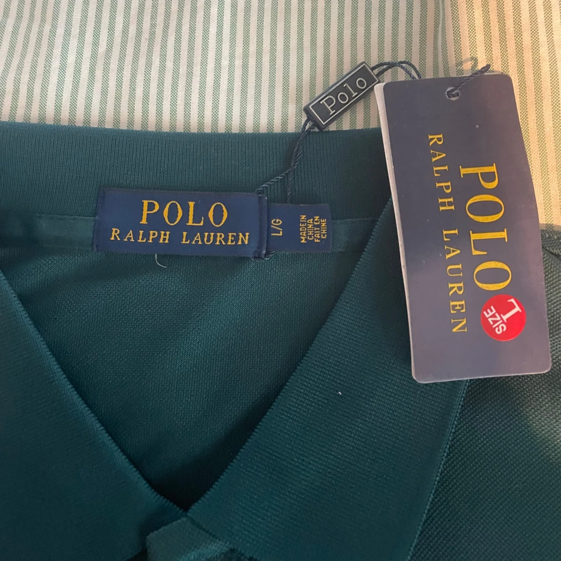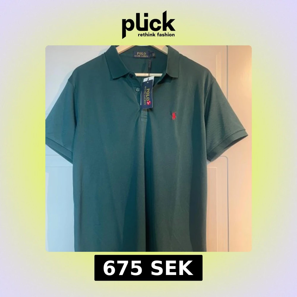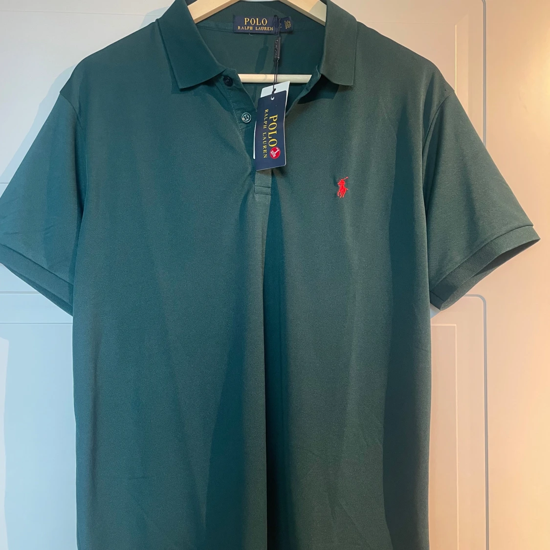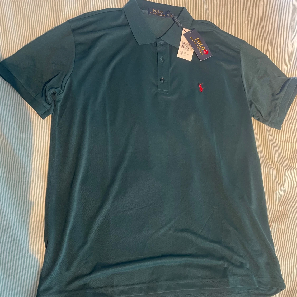 Snygg mörkgrön t-shirt från Polo Ralph Lauren med klassisk polokrage och korta ärmar. T-shirten har en röd broderad logga på bröstet och är gjord i 100% polyester för en skön och lätt känsla. Perfekt för dig som gillar stilrena plagg med ikonisk design. Aldrig använd och piska på sitter kvar.