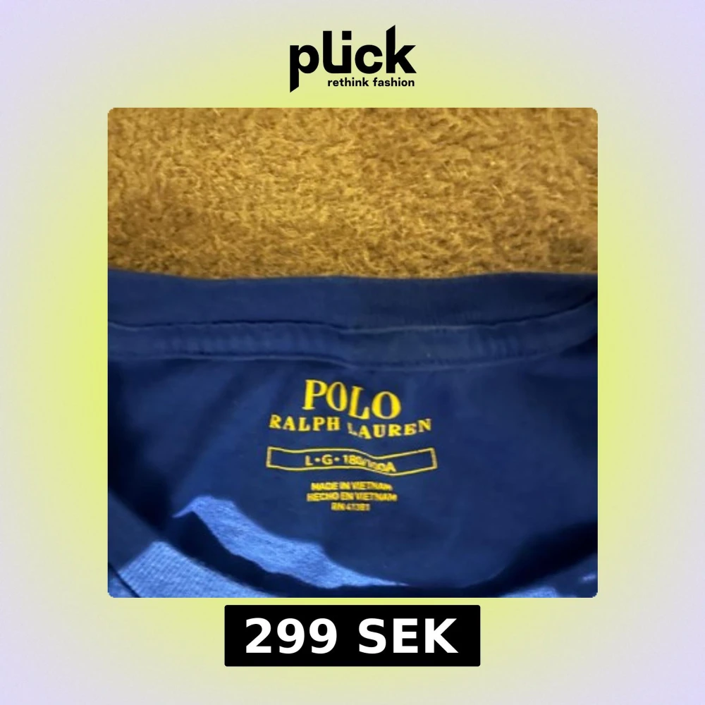 Säljer en klassisk blå t-shirt från Ralph Lauren med korta ärmar och en liten broderad logga i vitt nertill på framsidan, storlek L, pris ej hugget i sten