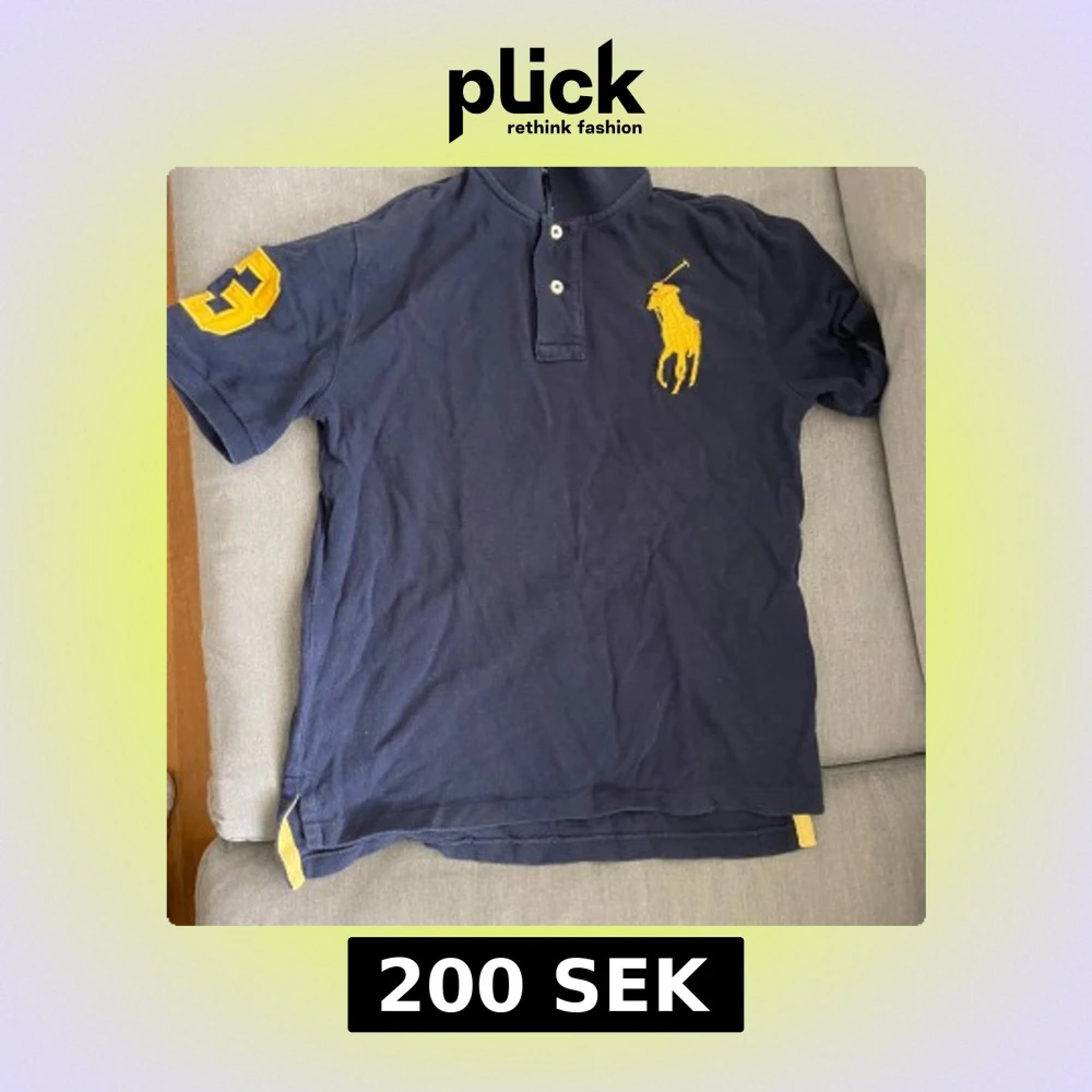 Säljer en mörkblå pikétröja från Polo Ralph Lauren med stor gul broderad logga på bröstet och siffran 3 på ärmen. Klassisk krage och knappar framtill. Perfekt för en sportig och stilren look.