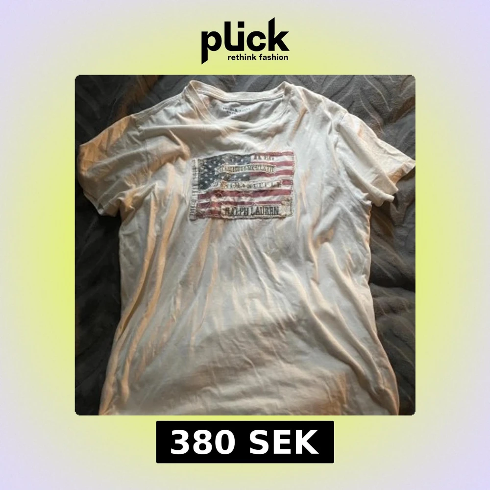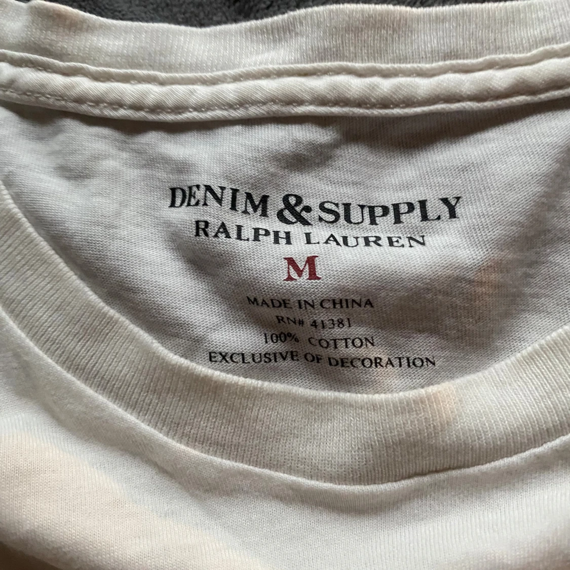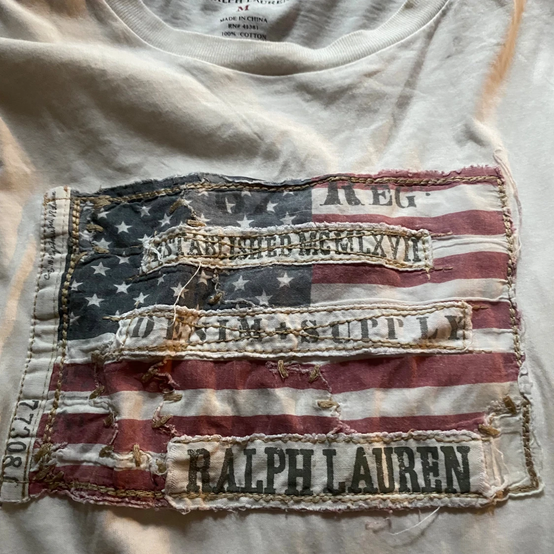 Vit t-shirt från Ralph Lauren Denim & Supply med ett stort amerikanskt flagg-tryck och broderade detaljer på bröstet. Klassisk rund hals och korta ärmar. Tillverkad i 100% bomull för en skön och avslappnad känsla. Om ni har fler frågor är det bara att skriva till mig!!