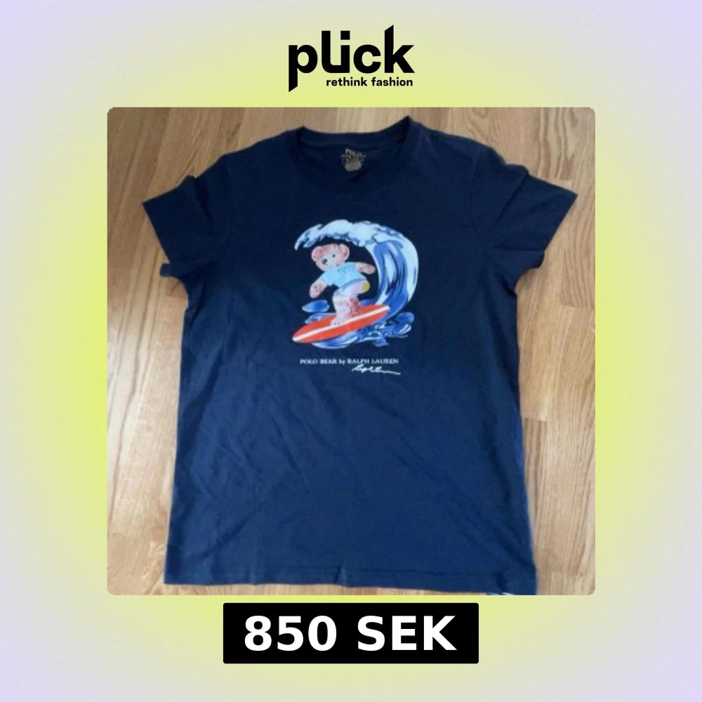 Mörkblå t-shirt från Polo Ralph Lauren med ikoniskt Polo Bear-tryck där björnen surfar på en våg. Klassisk rund hals och korta ärmar. Tillverkad i mjuk bomull, perfekt för en chill och stilren look. M men passar S