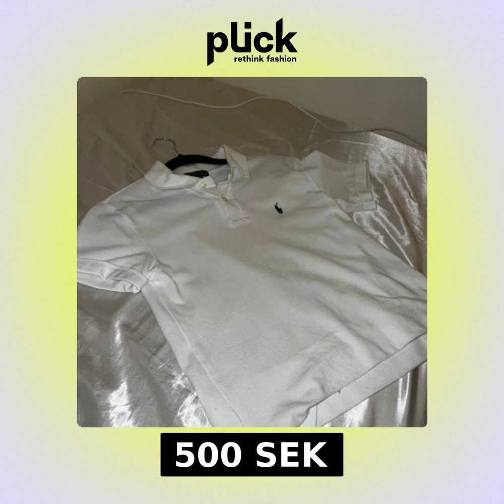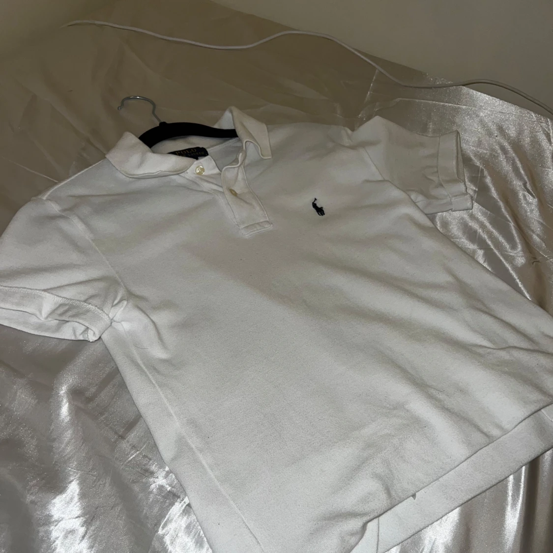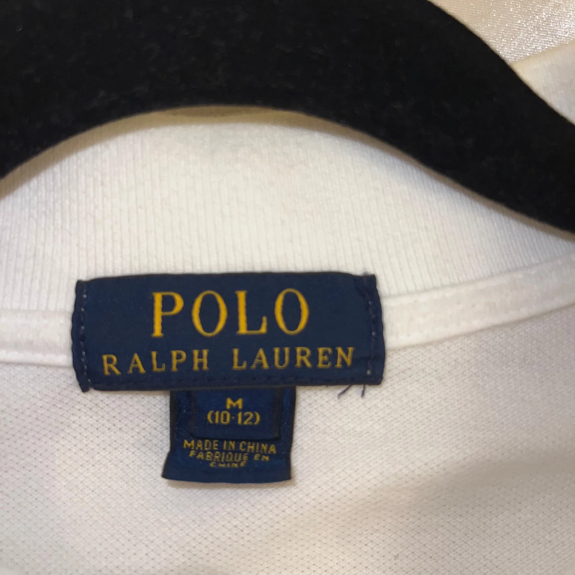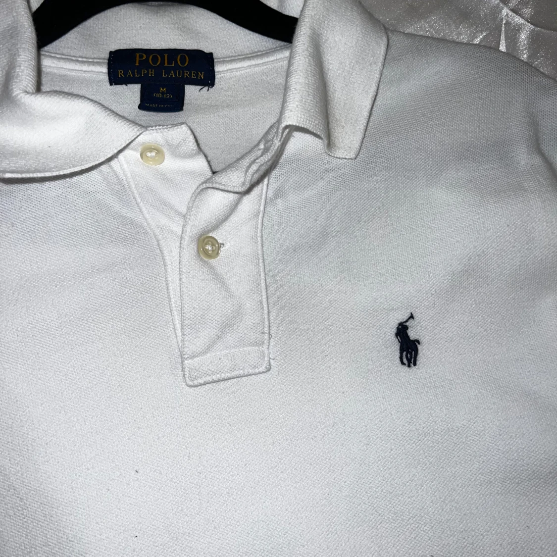 Vit klassisk t-shirt från Polo Ralph Lauren i storlek M. T-shirten har korta ärmar, krage och två knappar framtill. Den är gjord i mjuk bomull och har den ikoniska broderade loggan på bröstet. Perfekt för en clean och stilren look. OBS Tröjan är i junior storlek M