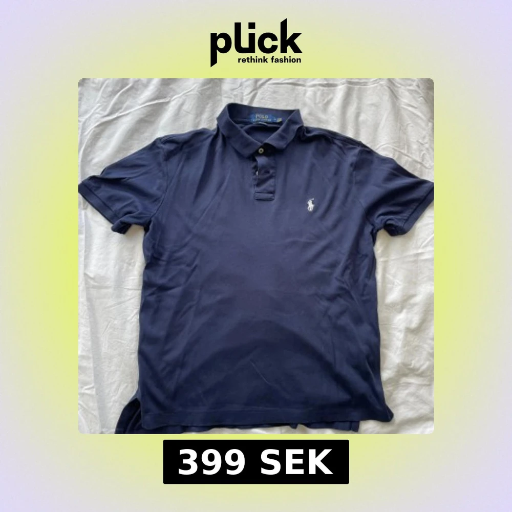 Säljer en klassisk marinblå pikétröja från Ralph Lauren i mjuk Pima-bomull. Tröjan har korta ärmar, krage och knappar framtill samt den ikoniska broderade loggan på bröstet. Perfekt för en clean och stilren look.