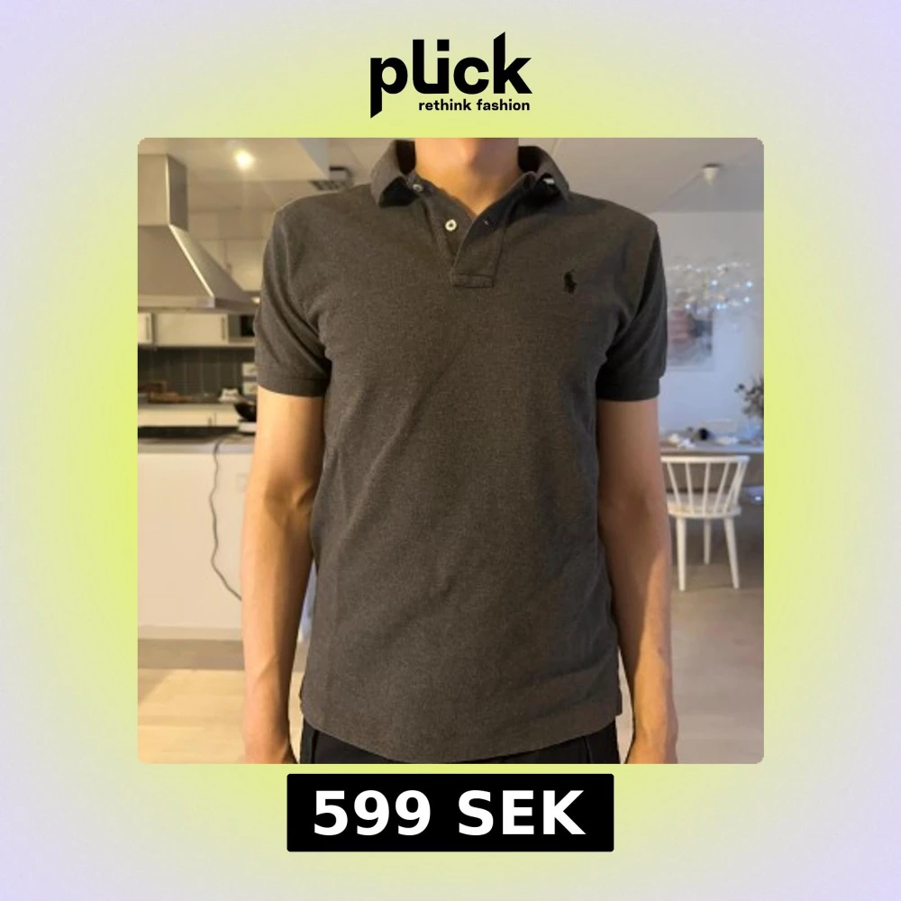 Snygg mörkgrå pikétröja från Ralph Lauren med klassisk krage och två knappar framtill. Tröjan har korta ärmar och den ikoniska broderade loggan på bröstet. Perfekt för en stilren och avslappnad look. Storlek S som passar stor.