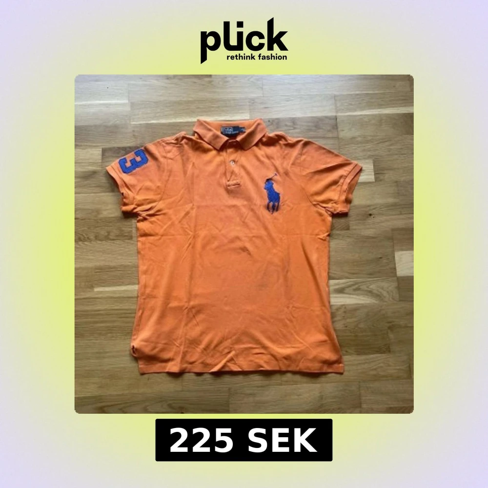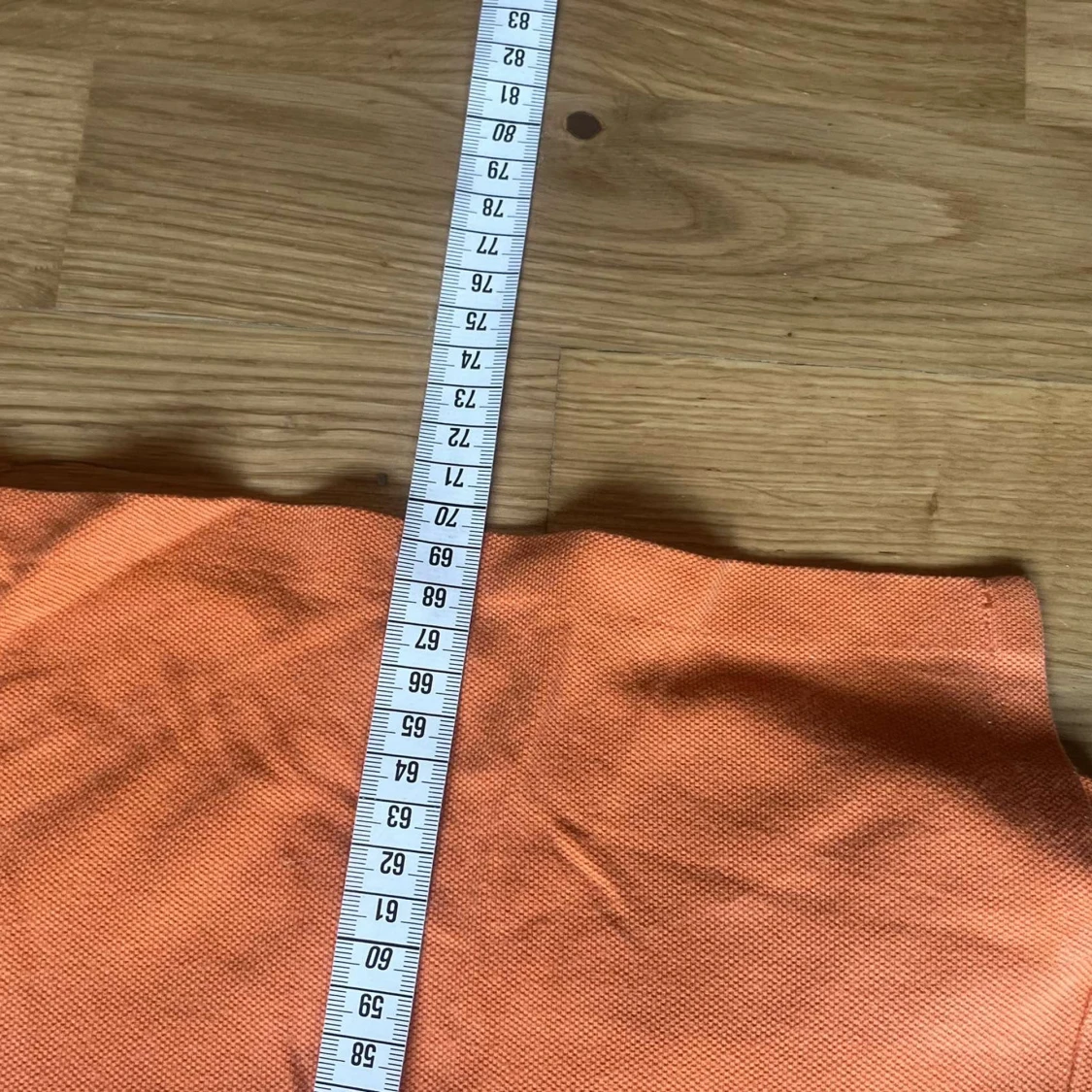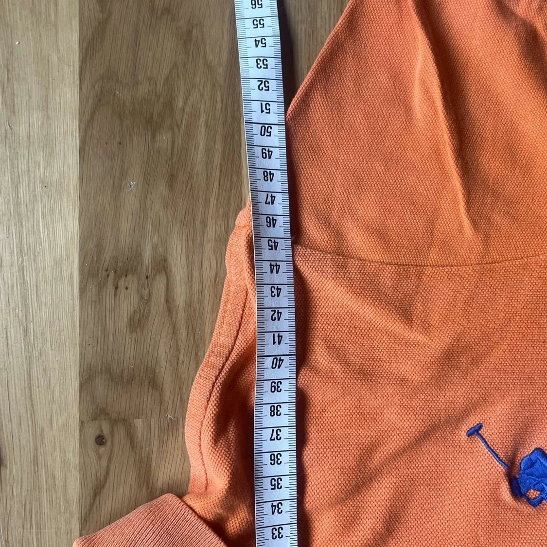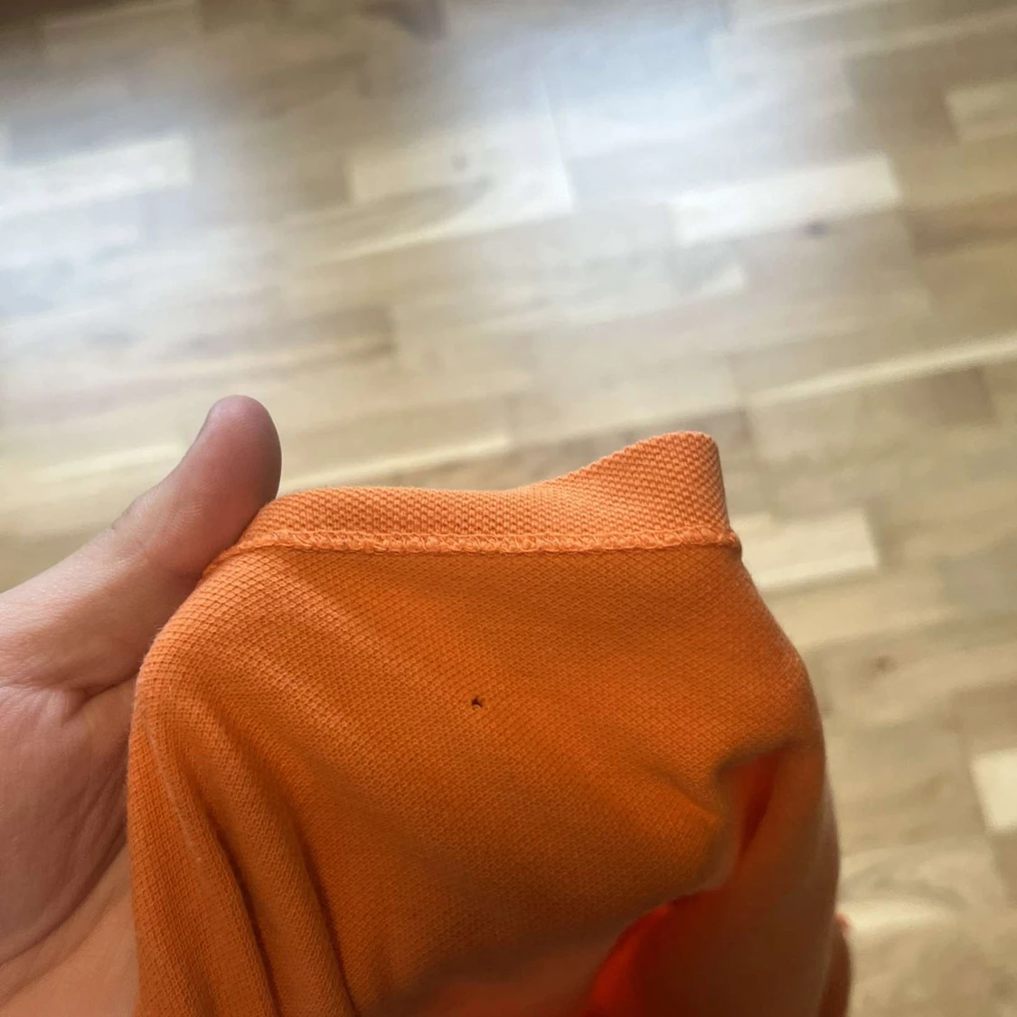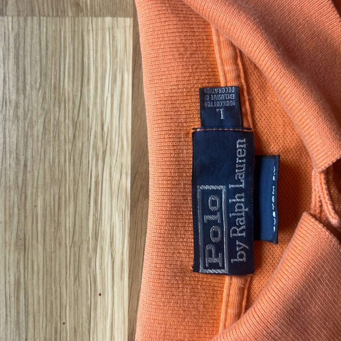 Orange pikétröja från Polo Ralph Lauren med blå broderad logga på bröstet och blå siffra på ärmen. Klassisk krage och knappar framtill. Tillverkad i bomull och har korta ärmar. Perfekt för en chill och sportig look. I använt skick med lite blekt färg och ett litet hål som syns på sista bilden :)