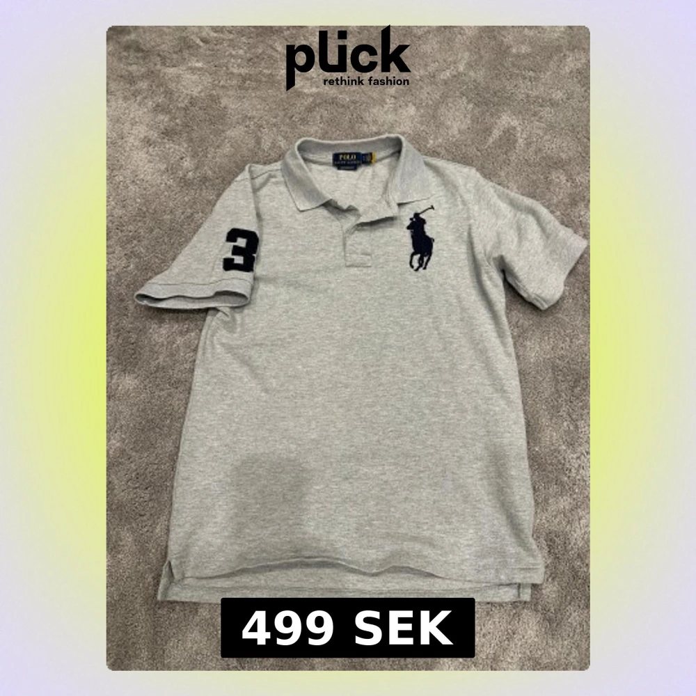 Snygg grå pikétröja från Polo Ralph Lauren i custom slim fit. Tröjan har korta ärmar, klassisk krage, stor marinblå logga på bröstet och en broderad siffra 3 på ärmen.