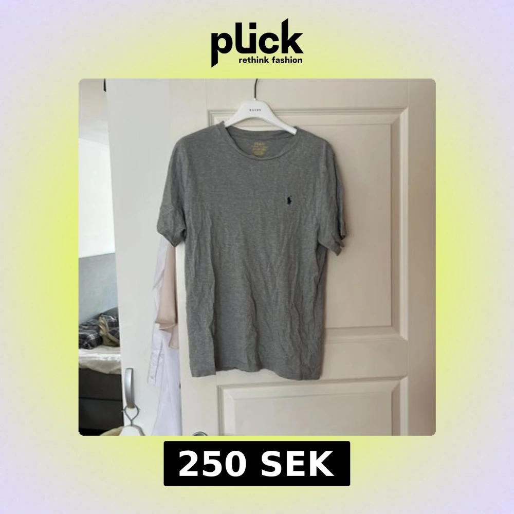 Säljer en klassisk grå t-shirt från Ralph Lauren med den ikoniska broderade loggan på bröstet. T-shirten är kortärmad och tillverkad i mjuk bomull. Perfekt för en avslappnad stil.