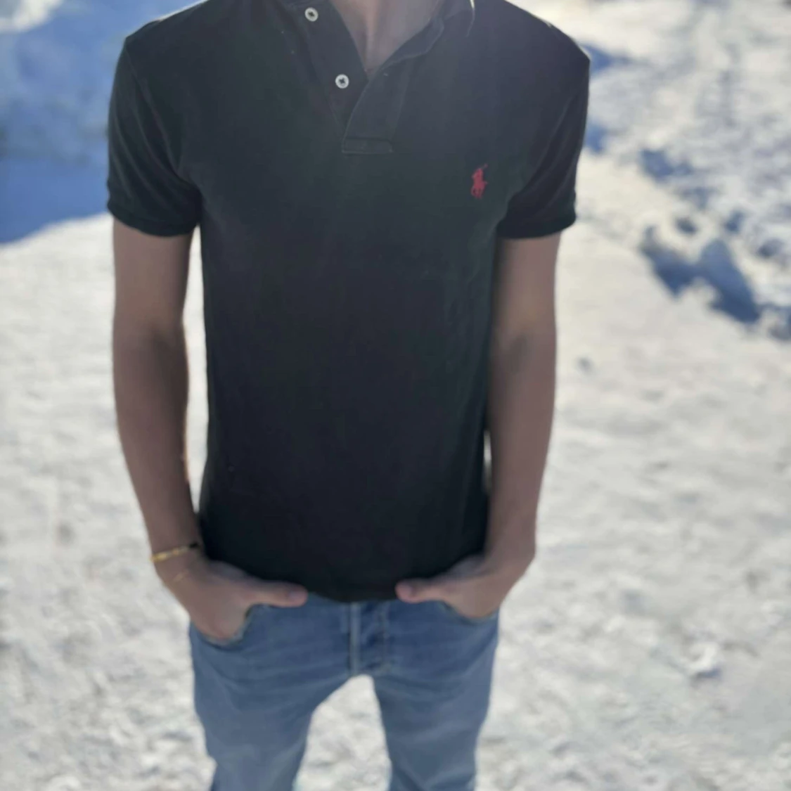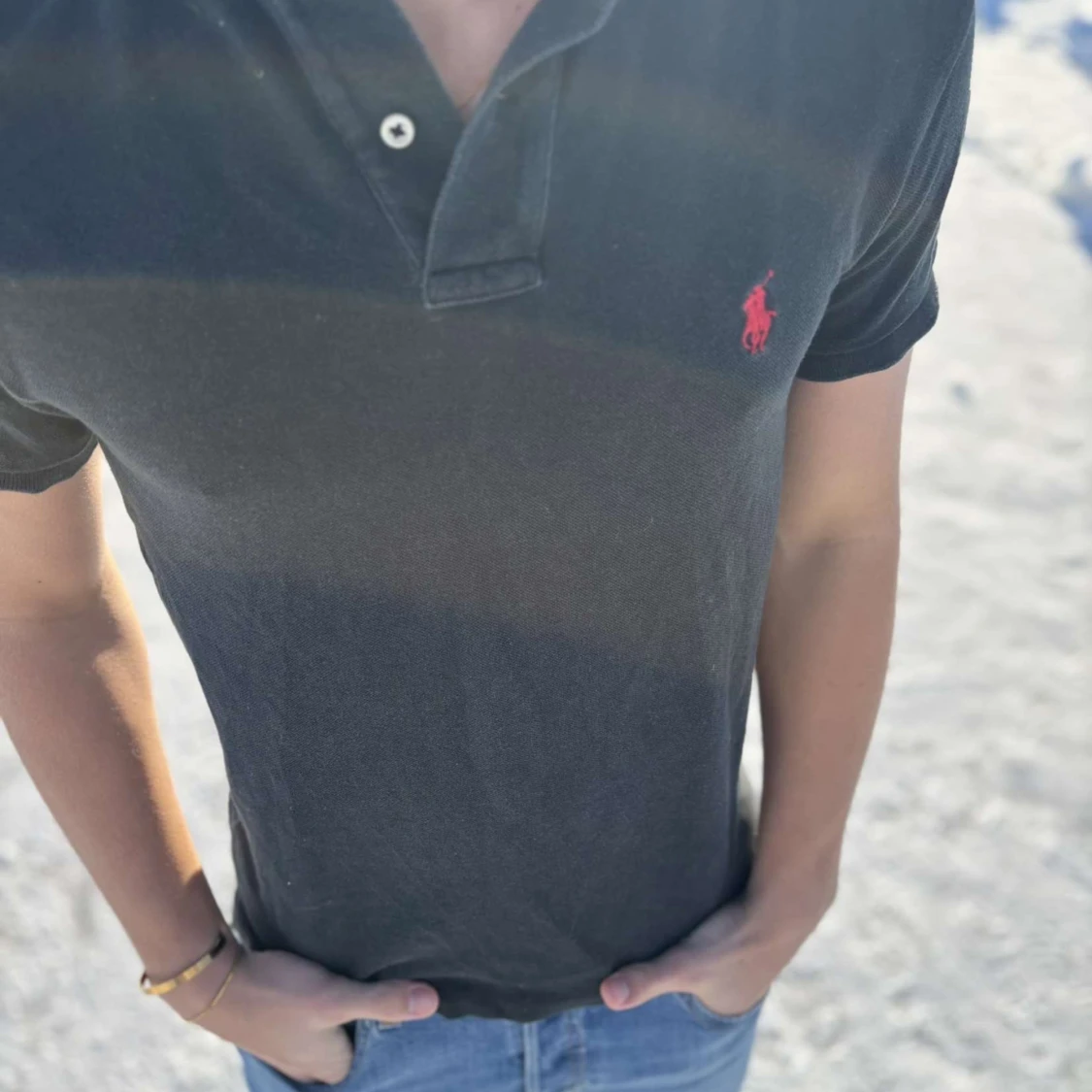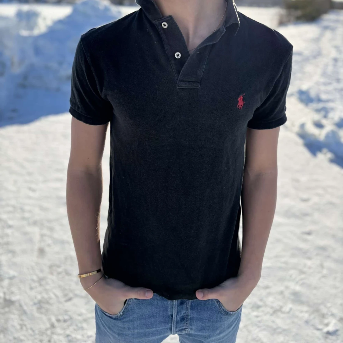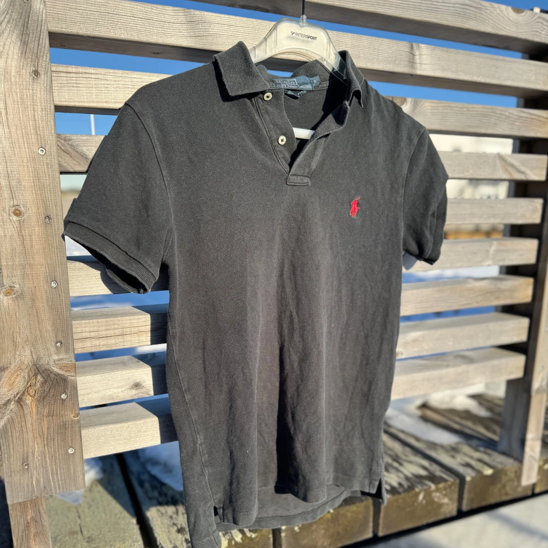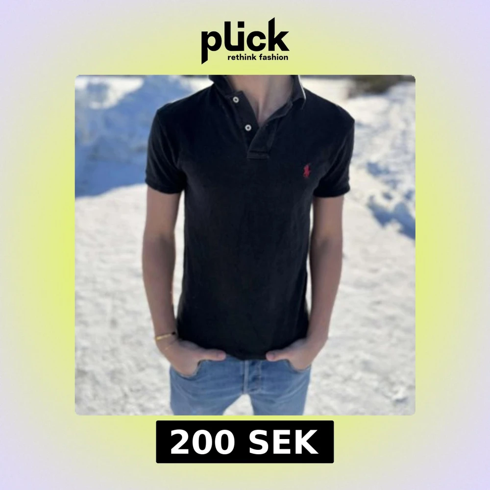 Snygg svart pikétröja från Ralph Lauren med klassisk krage och knappar. Den har en liten röd logga på bröstet som ger en stilren touch. Perfekt för en avslappnad men ändå stilfull look.